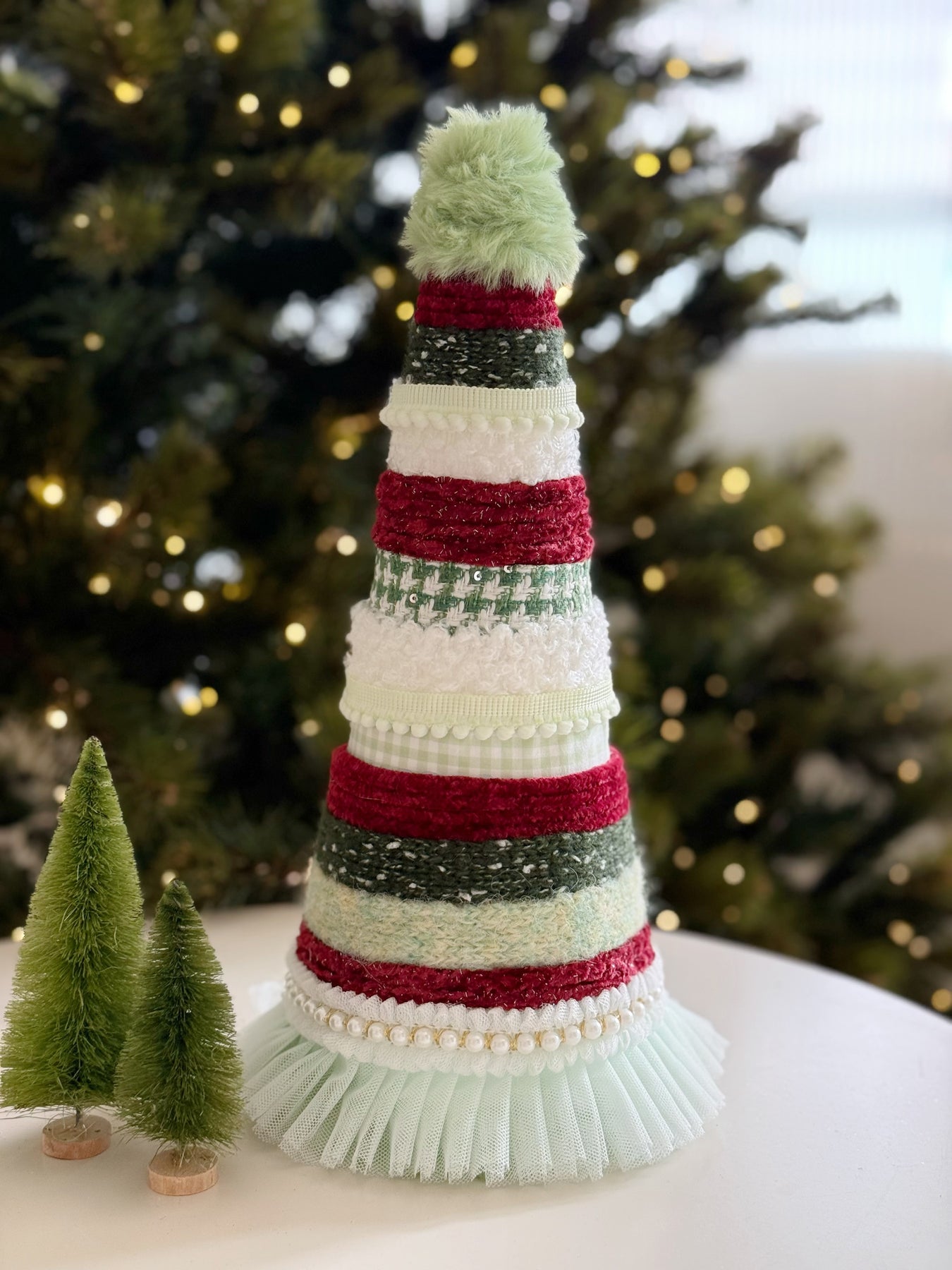 A handcrafted collection made lovingly by our own team, each tree in this series is a one-of-a-kind creation — no two are ever the same. Built on a lightweight styrofoam base and adorned with layers of ribbons, laces, and textured fabrics, every design tells its own charming story. From soft pastels to festive reds and greens, these sweet little trees bring a magical, cottage-style warmth to your Christmas setup.