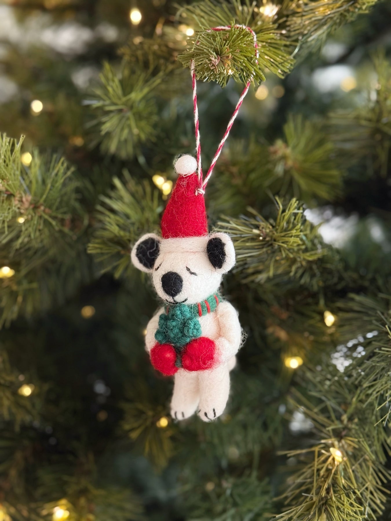 All dressed for Christmas, this handmade felt bear is ready to spread some cozy cheer! Wearing a little red Santa hat, matching mittens, and a green knit scarf, it’s the sweetest companion to hang on your tree.