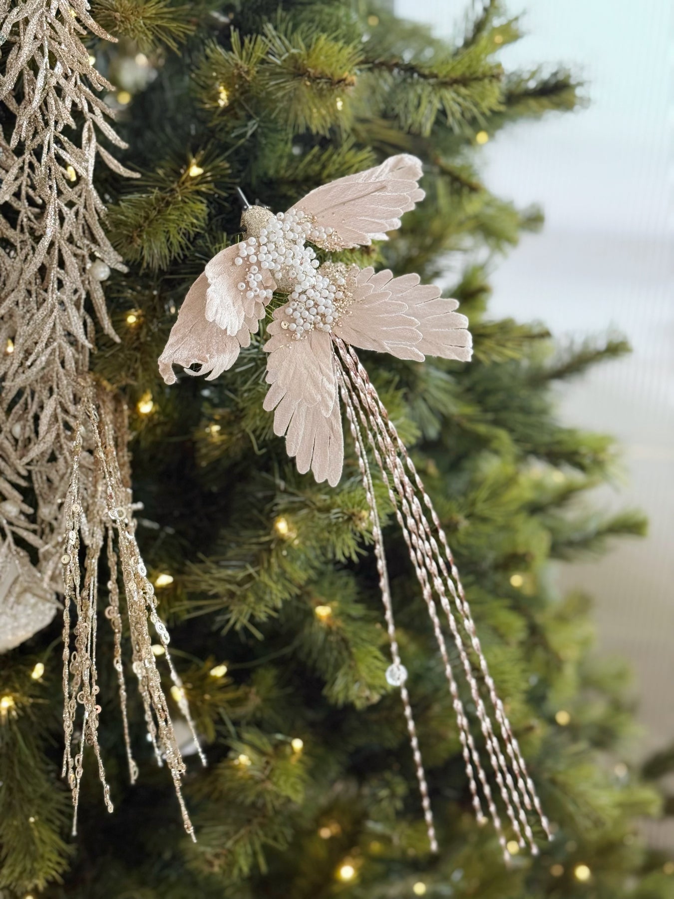 Bring a touch of soft-glam magic to your tree with our Champagne Luxe Tailfeather Bird Ornament — a breathtaking blend of elegance, texture, and movement.