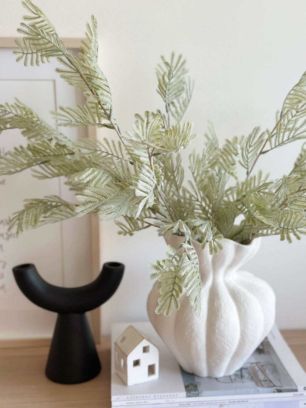 - 6 stalks of faux frosted mimosa branches are used in photo featured here.