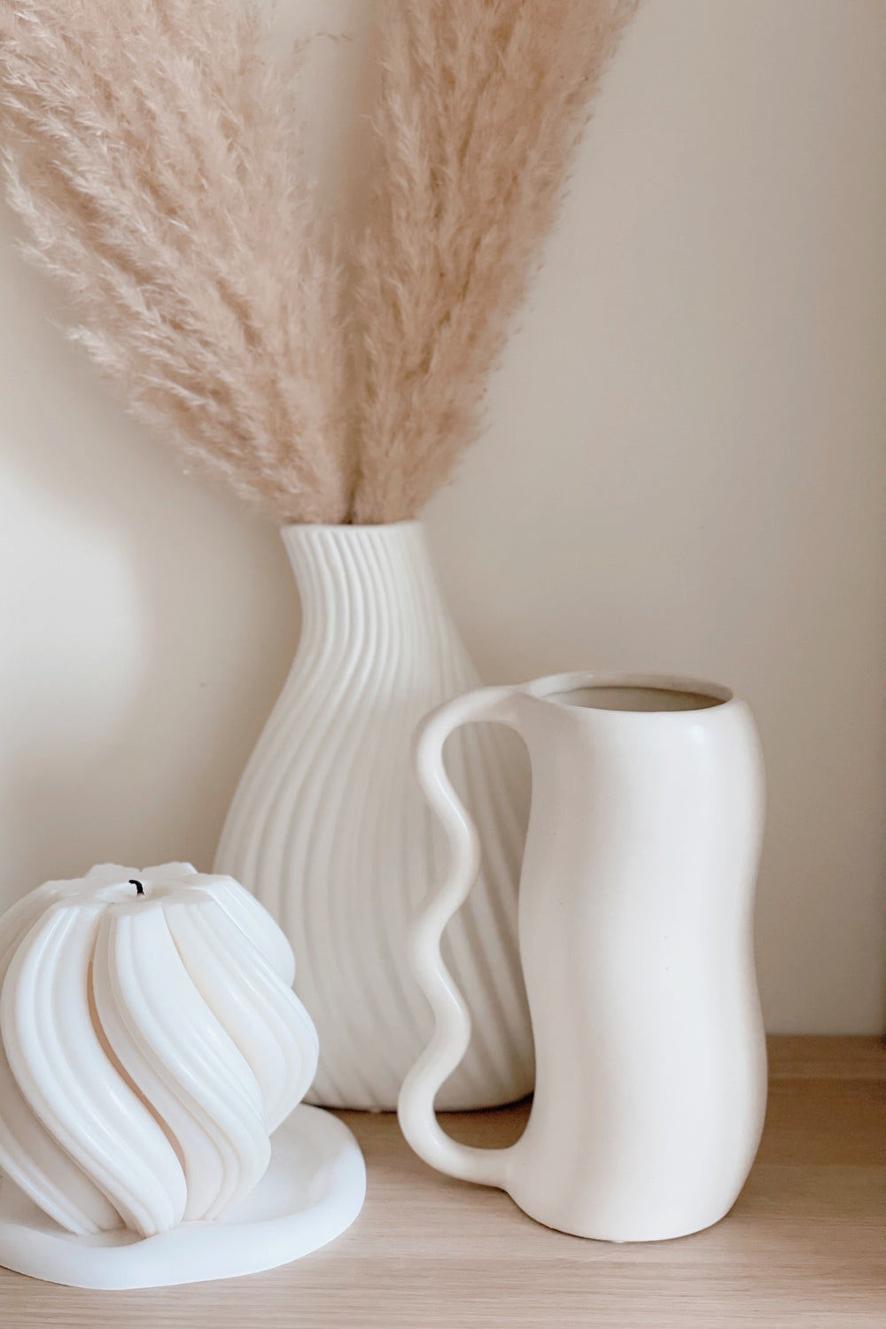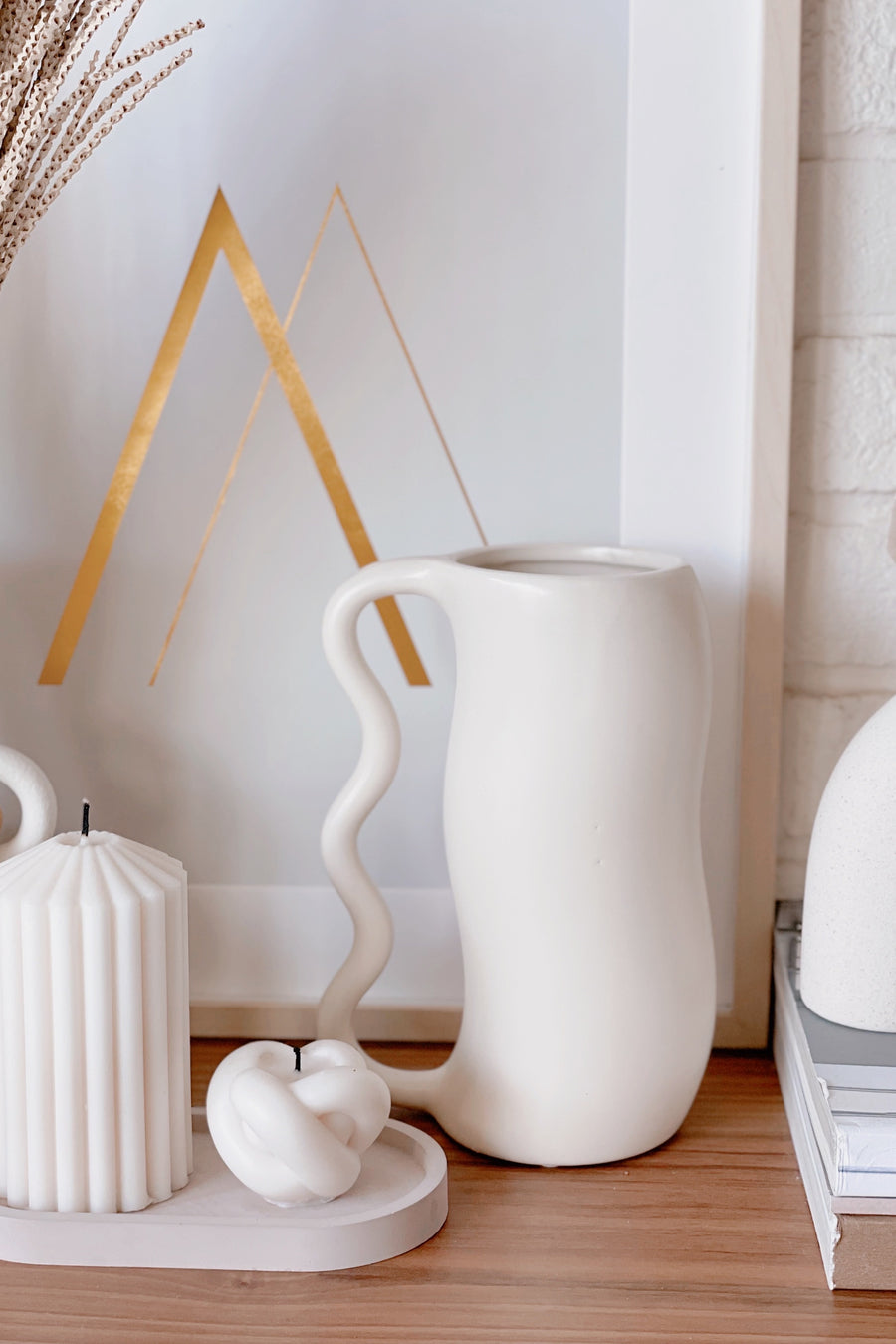 Our porcelain vase with a curvy body and handle in a beautiful creamy white colour. Its unique design resembles a pitcher, making it a stunning and functional decorative piece for any space. The creamy colour adds an elegant touch to any decor, while the flowing curves of the vase create a sense of fluidity and grace. Perfect for showcasing your favourite blooms or simply as a standalone decorative piece, our "Creamy Curves" vase is the ideal way to add a touch of refined beauty to your home or office.