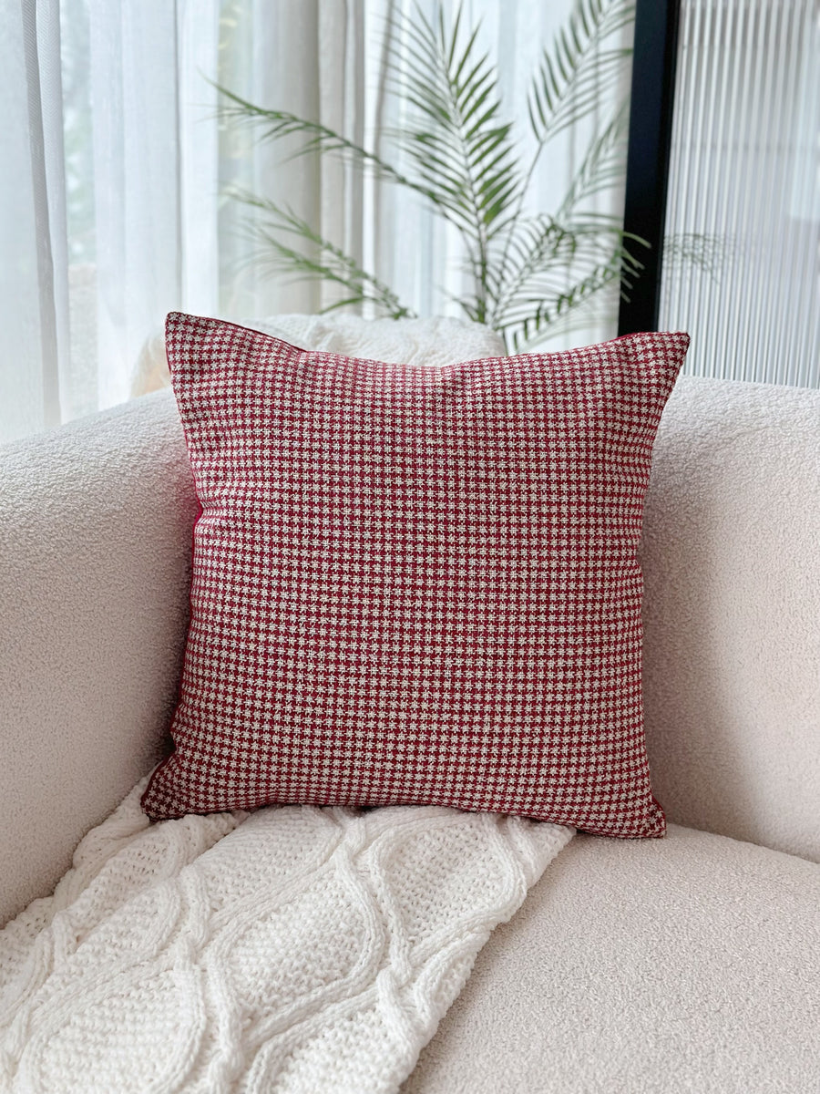 Add a touch of elegance to your home with the Deep Red Houndstooth Chic Cushion Cover. The front features a timeless houndstooth pattern in rich deep red, exuding both sophistication and charm. The back is made from a plain deep red fabric, offering a sleek and seamless contrast. Perfect for creating a classic and cozy ambiance, this cushion cover fits beautifully in both modern and traditional spaces. Ideal for layering or as a standalone piece, it brings a stylish statement to your living room, bedroom, or study.