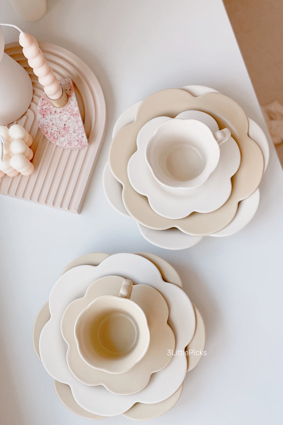 Lovely collection of tablewares made from porcelain in semi-matt finishing. These tablewares are in a dainty flower shape and in gorgeous muted tone of cream & beige! While they won’t steal the show of your dishes / pastries, they remain so unique with the petal rims around.