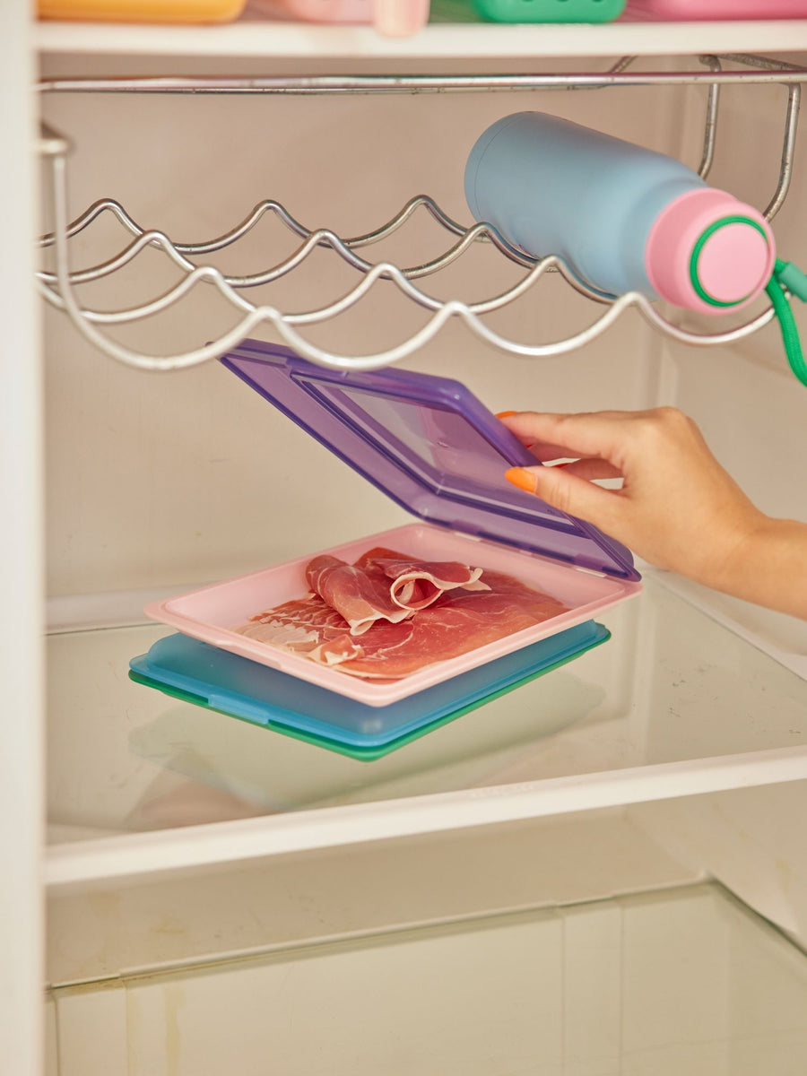 Organise your kitchen with our practical food box in soft pink with a lavender-coloured lid. It’s perfect for storing your favorite ham and other cold cuts in the fridge, keeping them fresh and ready for your next meal. The size makes them perfect for stacking – leaving your space clean and organised!