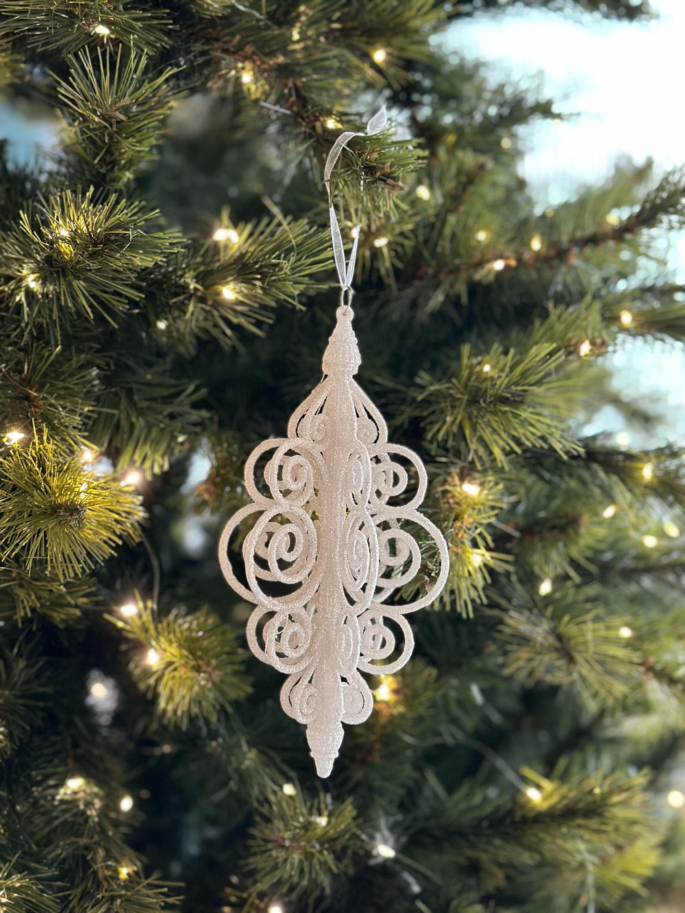 Add a touch of elegance and sophistication to your holiday decor with the Glittering Scroll Icicle Ornament. This stunning ornament features a delicate scrollwork design that twists into a graceful icicle shape, coated in shimmering champagne-white glitter for a festive glow. Its intricate, openwork pattern allows the lights of your Christmas tree to shine through, creating a dazzling effect. Lightweight and easy to hang, this ornament is perfect for adding a refined, vintage charm to your tree, making it a timeless piece that will elevate your holiday celebrations year after year.