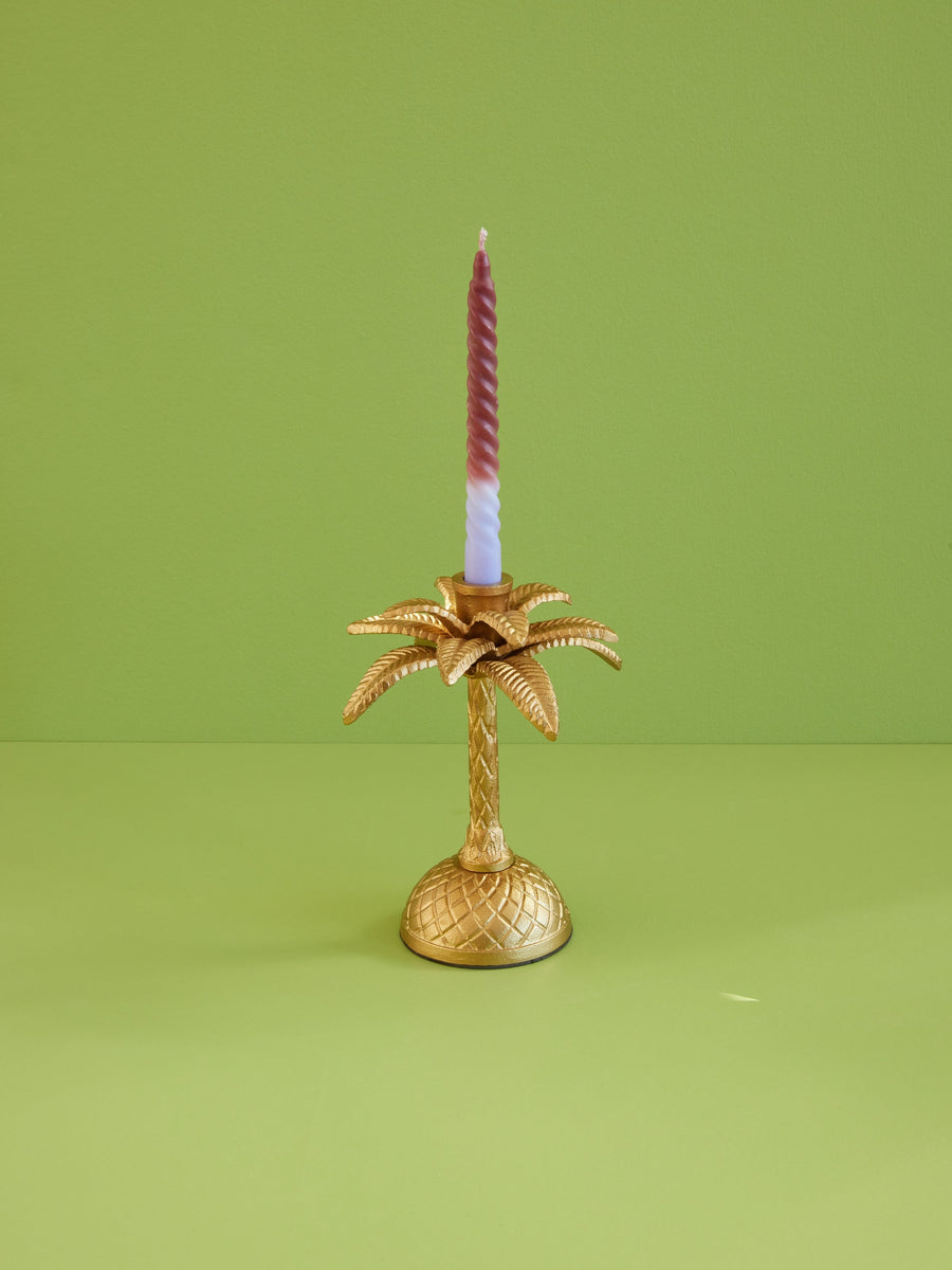 Tall and fun golden candleholder shaped like a palm tree. It is made of metal and is perfect for both a splash of color in the living room and a funky table setting!