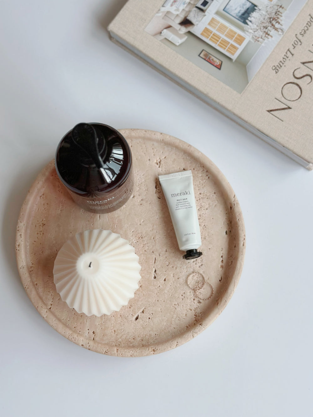 This round tray, exquisitely crafted from premium travertine stone, stands out with its unique character. Measuring dia.25cm, it's not just its size that makes it special, but the distinct nature of travertine. Travertine is celebrated for its natural random pores and holes, a result of gases escaping as the stone forms. These markings create a beautiful, rustic texture, making each tray one-of-a-kind. The beige and cream hues of the stone are complemented by these natural imperfections, adding charm and an organic feel. Though polished for a smooth finish, the tray retains these characteristic features, making it not just a functional item, but a piece of art. It's perfect for those who appreciate the raw beauty of natural materials in their home décor.