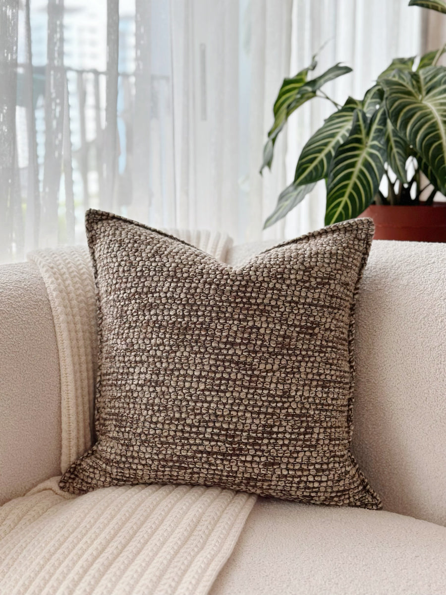 Add a rich, grounding touch to your space with our Mocha Pebble cushion cover. This piece is all about texture — a beautifully tactile boucle-like weave in cozy coffee tones that brings subtle depth and character. The pebbled front offers a touch of dimension, while the back comes in a smooth, matching plain fabric to keep things clean and versatile. It layers effortlessly with neutrals, patterns, or other earthy hues — a quiet statement that feels warm and lived-in. Perfect for snuggling into your couch corner or dressing up a bed without feeling overdone.