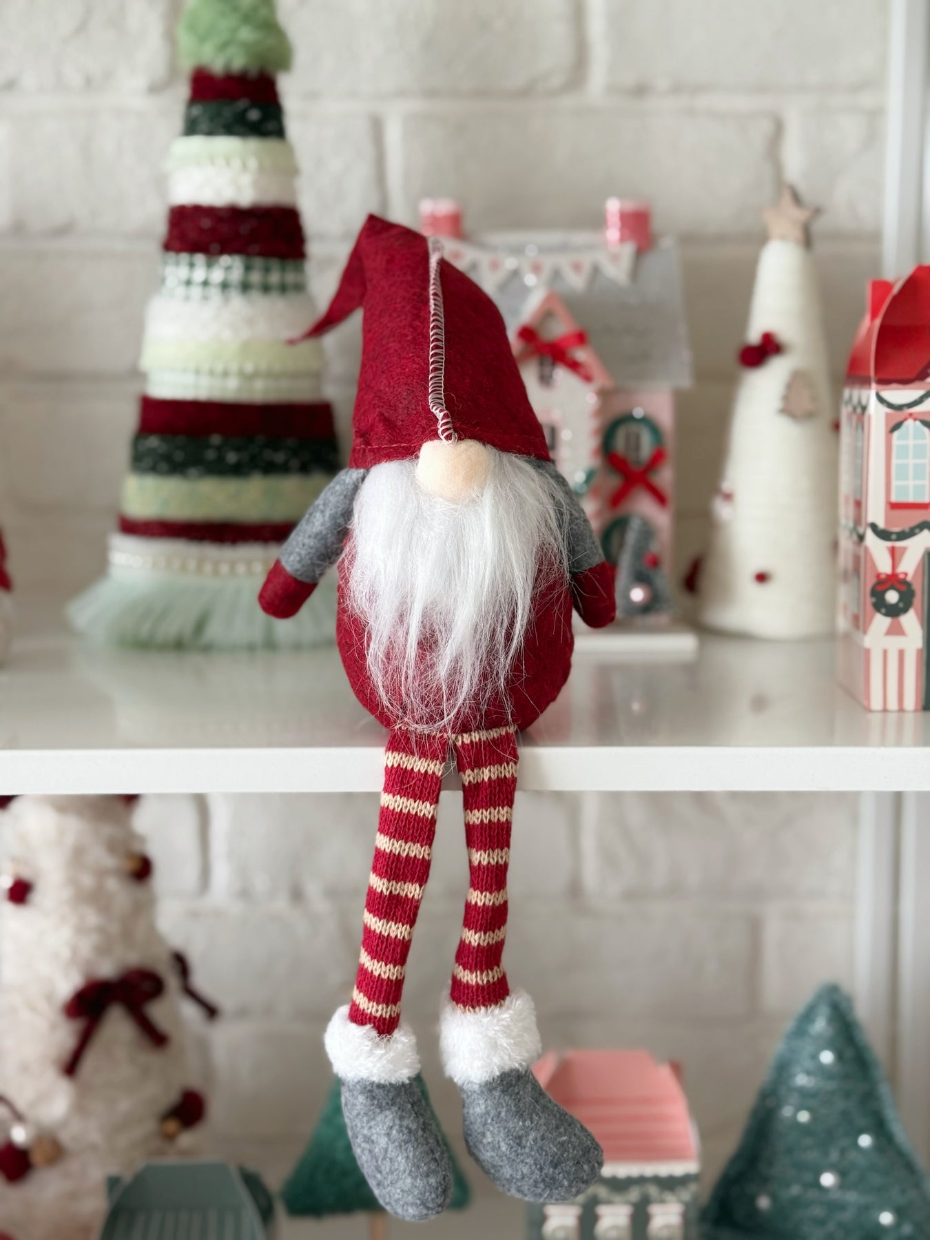 Bring cozy Scandinavian charm to your Christmas décor with these adorable long-leg gnomes. Each features a soft felted body and shoes paired with knitted striped legs, topped with a tall pointed hat and fluffy white beard.