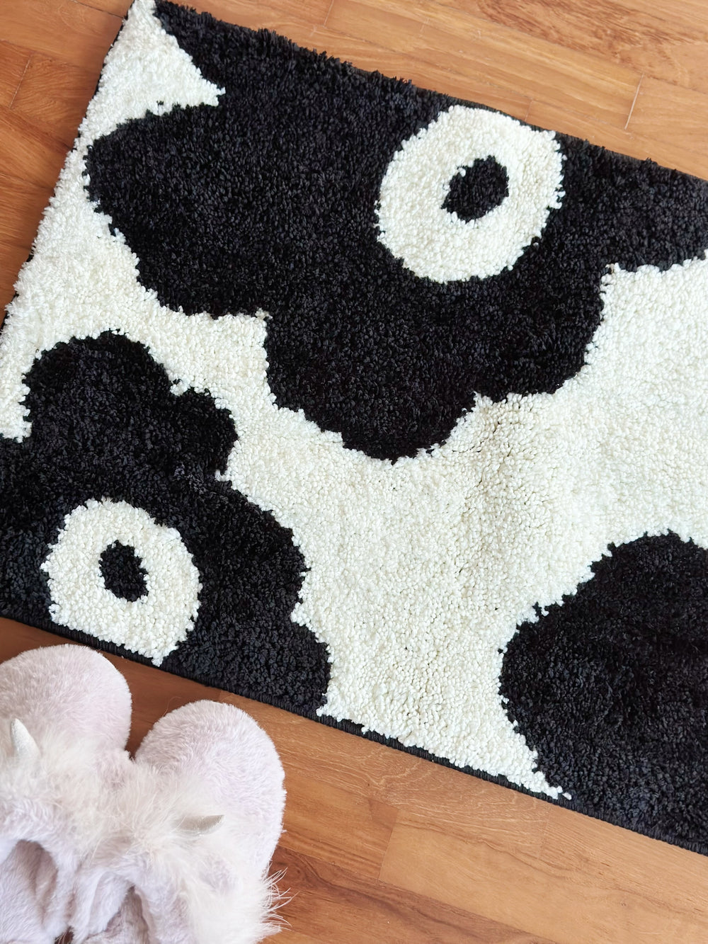 Introduce a touch of artistic flair to your home with the OpticArt Deco Floor Mat. This visually engaging mat features a dynamic black and off-white pattern that draws the eye and adds an element of modern artistry to any room. Its abstract, eye-like designs offer an optical allure, transforming a functional item into a conversation piece.