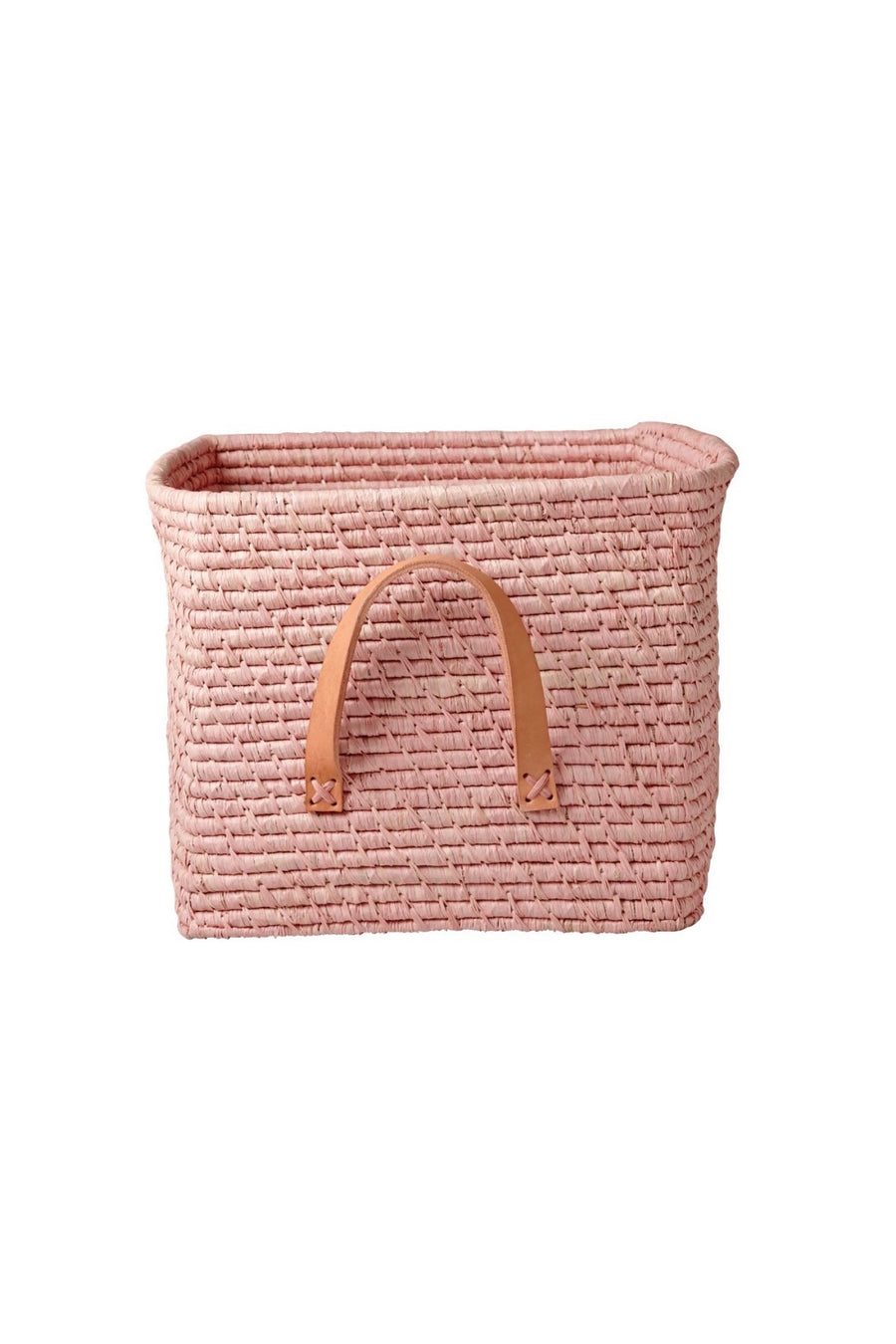 Small square pink raffia basket with leather handles. Great for storing everything from books and papers, to candles, napkins and all the other odd things you want out of plain sight, but still need to keep in an organized fashion.All our raffia products are handmade in beautiful Madagascar. Raffia is a natural material and this means each item will vary slightly in color and size. We think this is part of the charm… If constantly exposed to sunlight the colors will fade. Keep away from water as this will cause the dye to rub off.