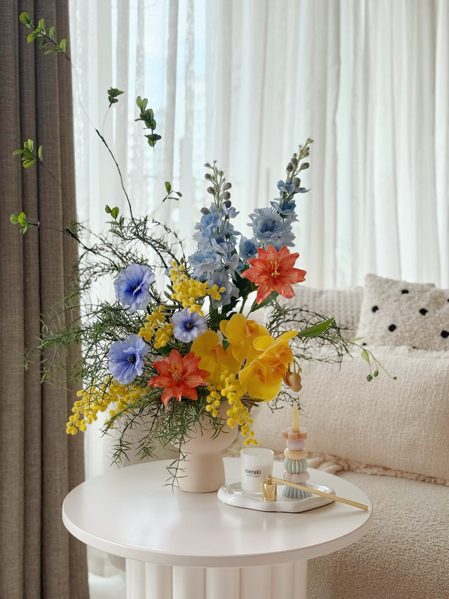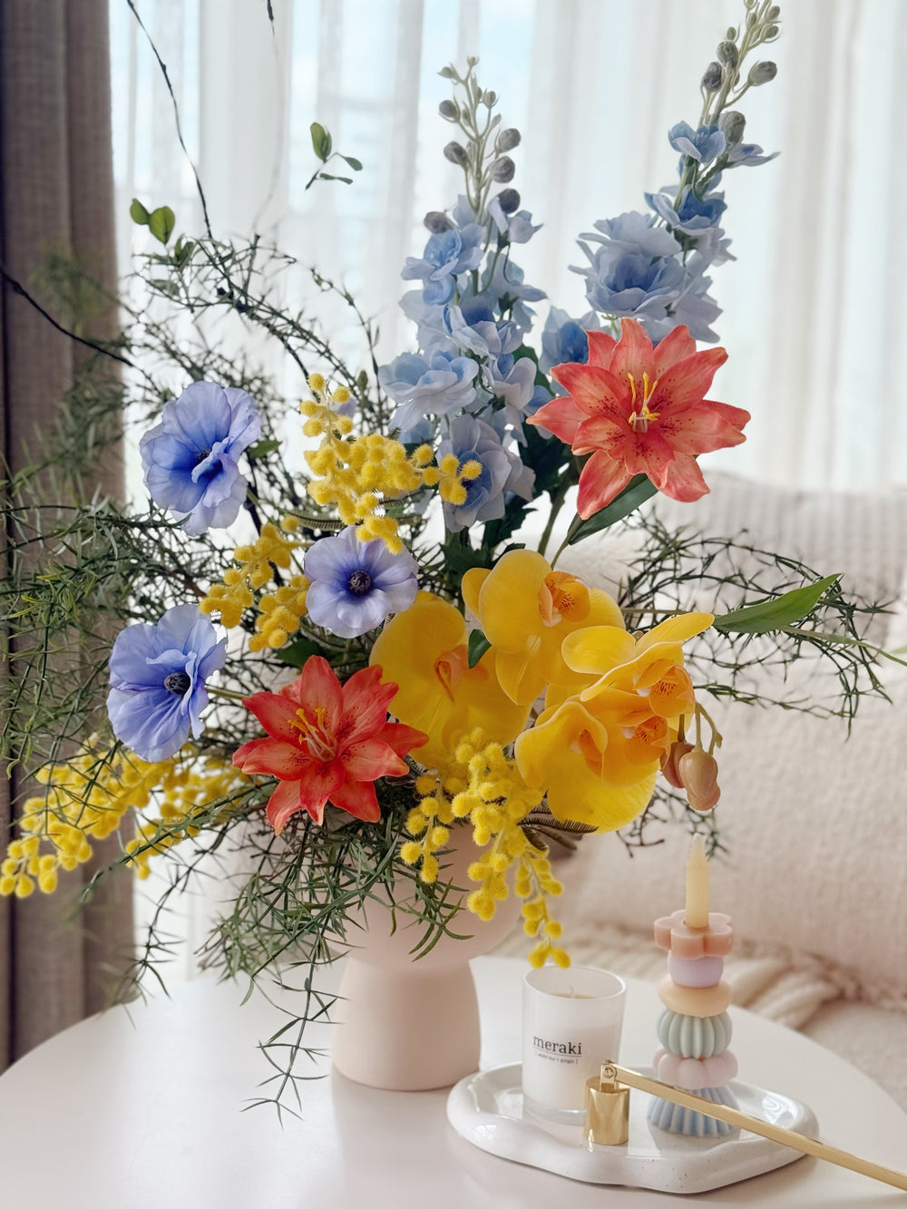 Radiant and refreshing, this arrangement captures the glow of a golden sunrise meeting a clear blue sky. Bright yellow orchids and mimosa blossoms radiate warmth, while coral lilies and soft blue delphiniums add depth and contrast, all set against a backdrop of airy greens.