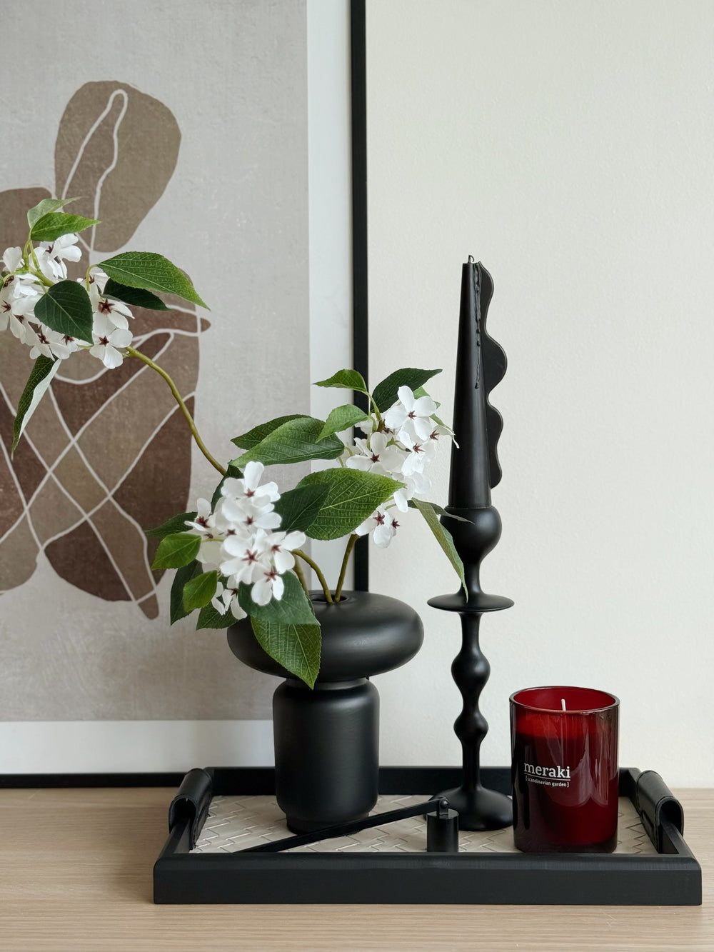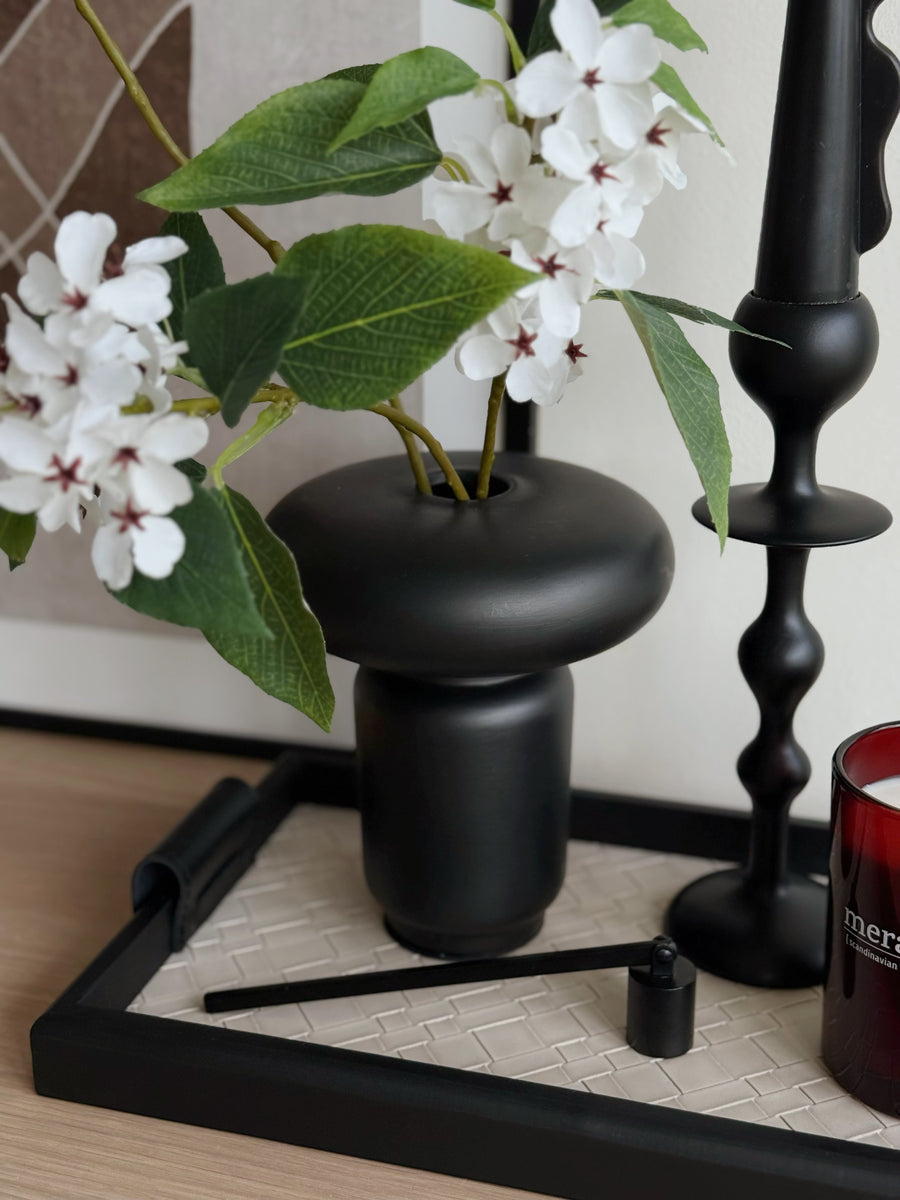 The vase's raw porcelain construction speaks to modern sensibilities, offering an organic texture that's both visually appealing and pleasant to touch. A sleek black hue encompasses the surface, enhanced by subtle speckled details that contribute to its artisanal charm. These features culminate in a versatile aesthetic, making this vase a suitable companion to various decor themes.