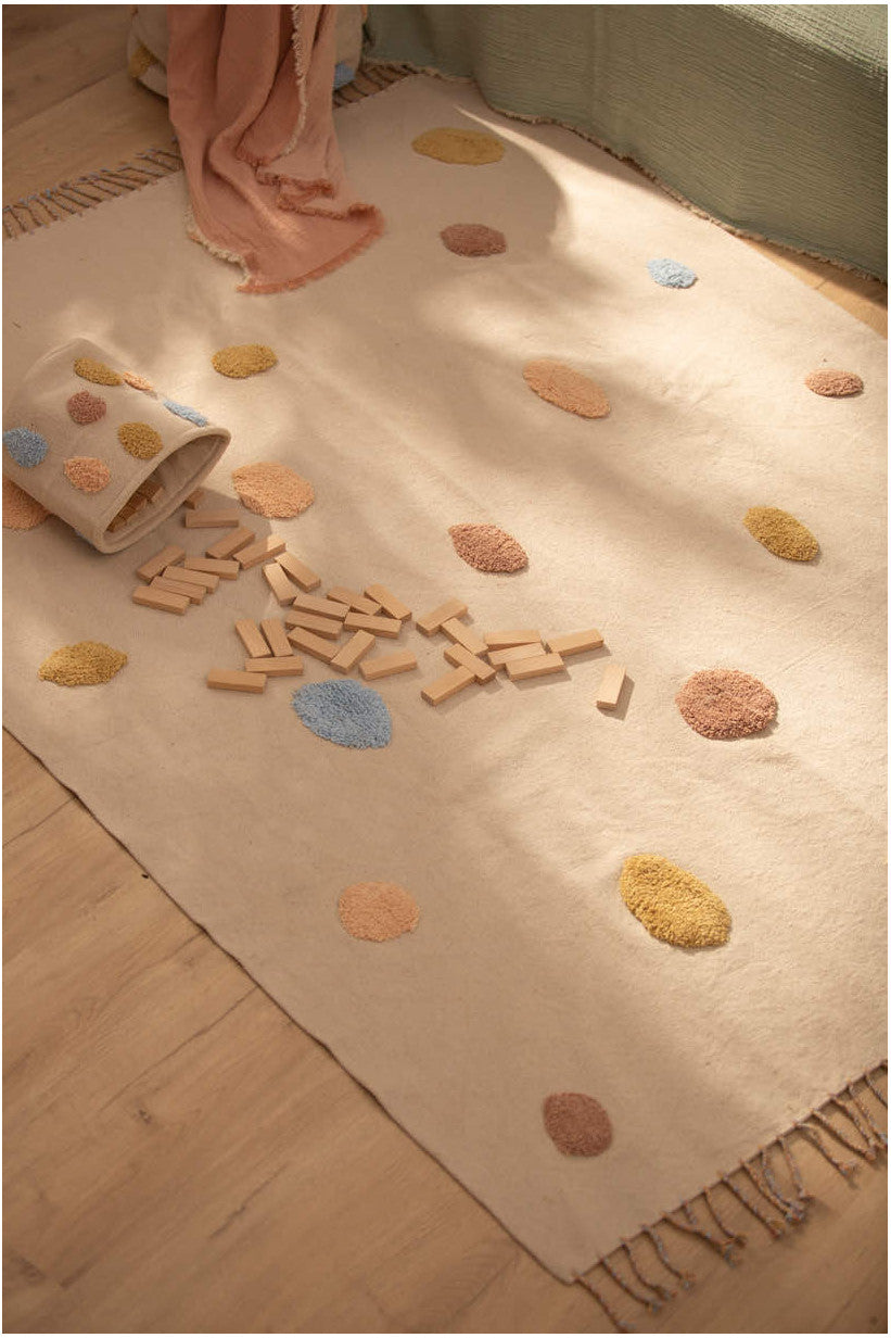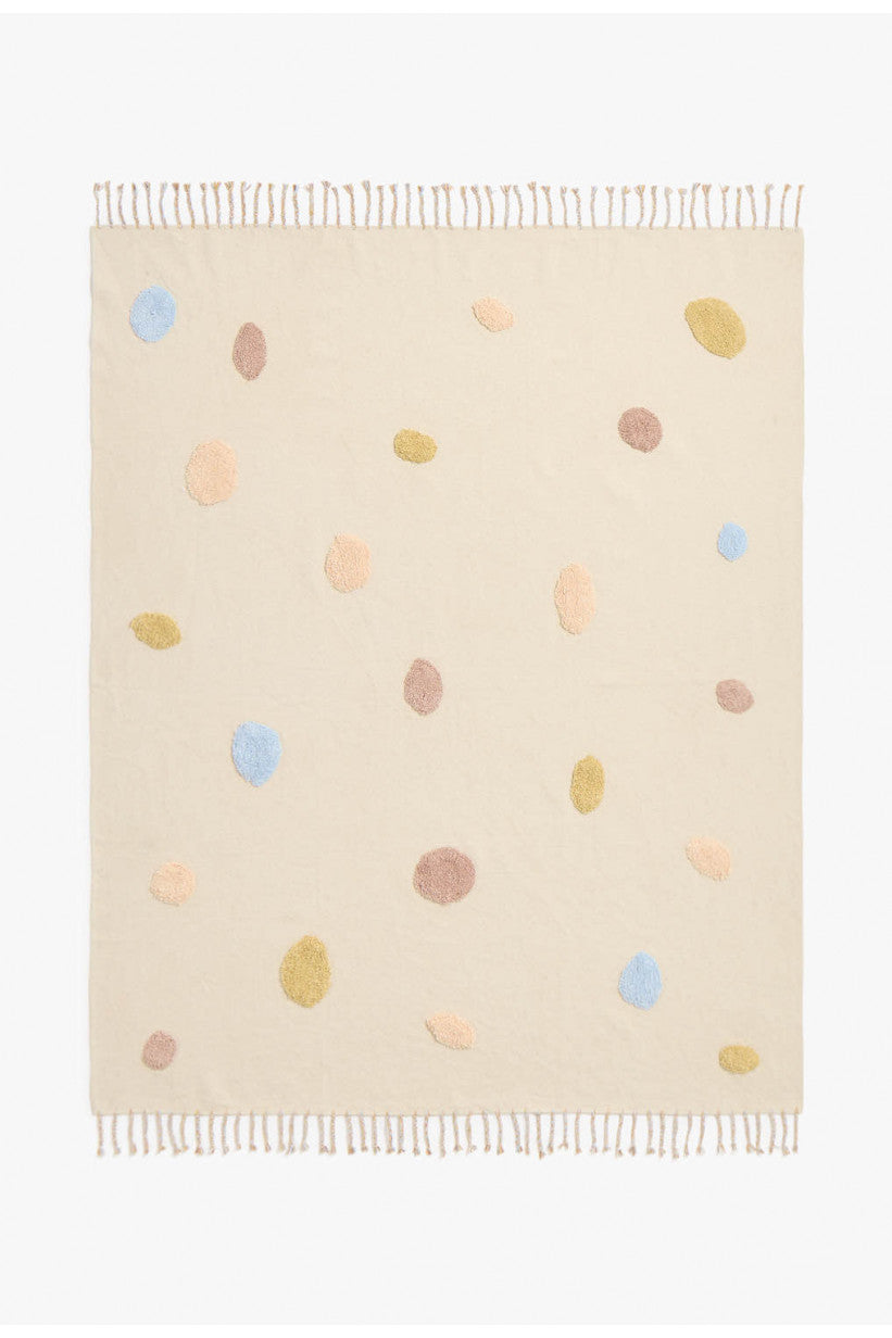 This beautiful textured hand woven cream cotton rug with beautiful irregular pastel tufted details across and finished with soft fringe on both sides which add a cozy Bohemian feel to your home. It is ideal to be used in bedroom or play room.