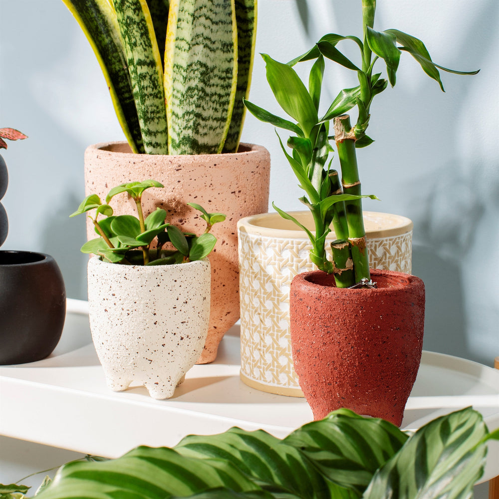 Characterised by an organic texture and complete with three standing legs. Available in three assorted colourways of brick, blush and sand. Ideal for housing medium sized plants.