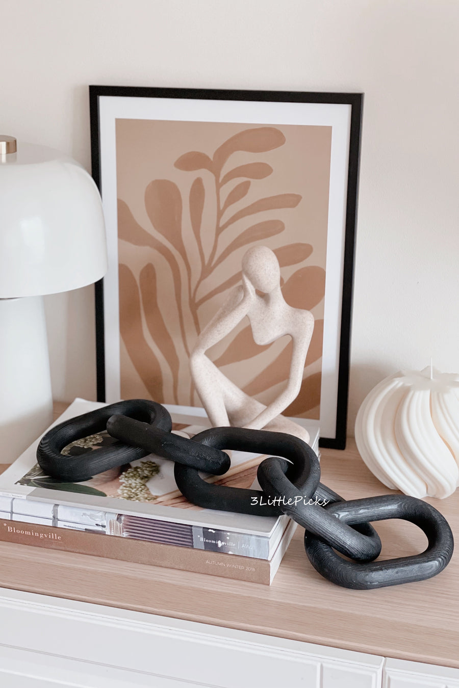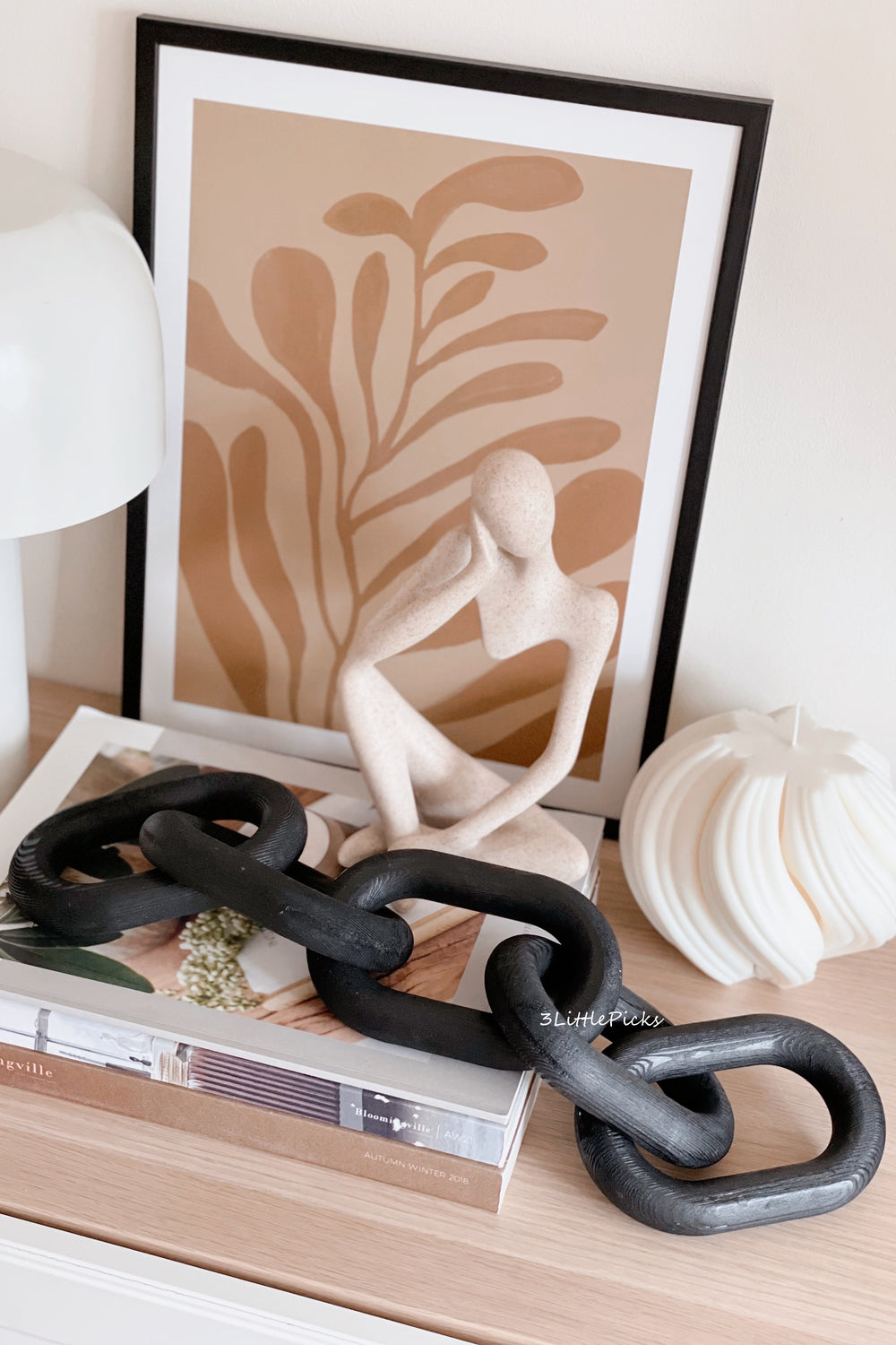 Add some Scandinavian glamour to your interior decor with this wooden chain decor object. A modern statement, this oversized chain is carved from natural wood with a untreated finish in a sleek black. A simple decor piece that creates different forms like puzzle pieces.