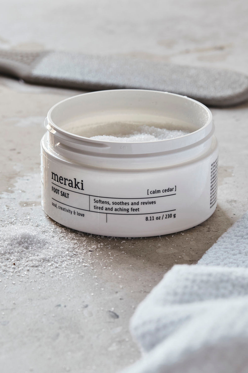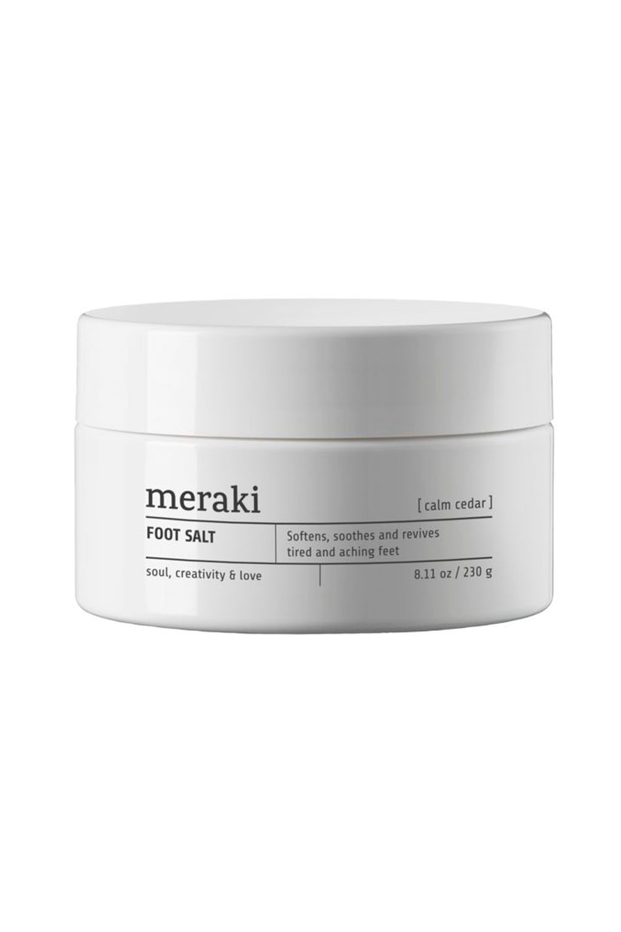 Revive tired and aching feet with this foot salt from Meraki. The salt called Calm Cedar is a sea salt which softens, soothes and revitalises your feet after a long day. Relax and take a well-deserved time out with a foot soak while you enjoy the energising scent of eucalyptus, mint and lime. Simply add the salt to a basin filled with lukewarm water and mix. We recommend 2-3 tablespoons for 5 litres. Soaking your feet is a simple and easy way of pampering yourself after work or when you simply want to enjoy a relaxing moment. Certified by ECOCERT Natural.