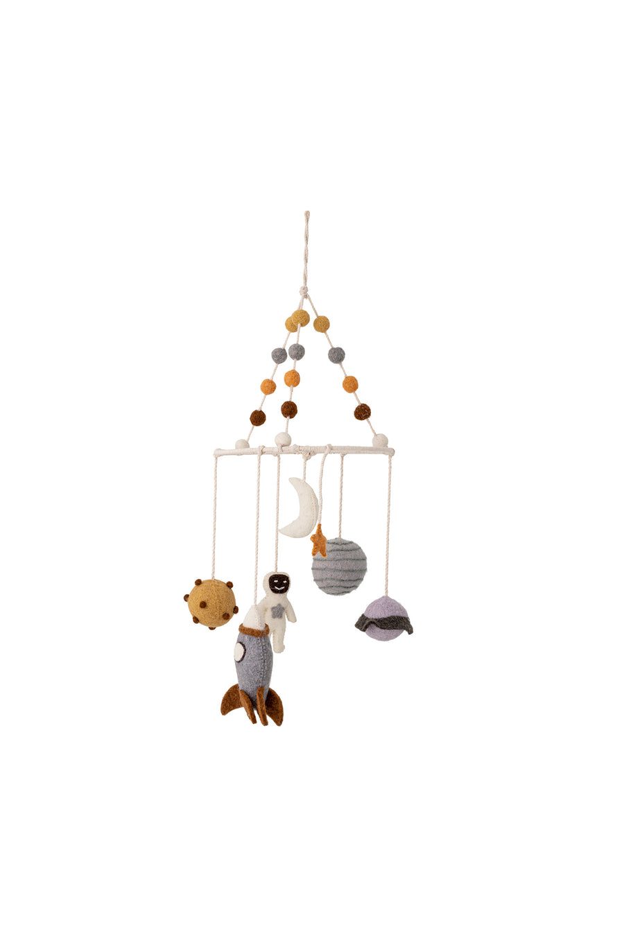 Stimulate your baby's senses with this adorable hanging mobile from Bloomingville. Portrays figures in a playful space theme: various celestial bodies, an astronaut, and even a spacecraft all drifting together in the harmony of endless space, this mobile is made of 100% wool fibres, it's bursting with charm. Hang the mobile from the ceiling as a delightful spectacle for baby and adults. It will surely entertain and relax your baby whenever he sees it, stimulating his movements as well as his fantasy!