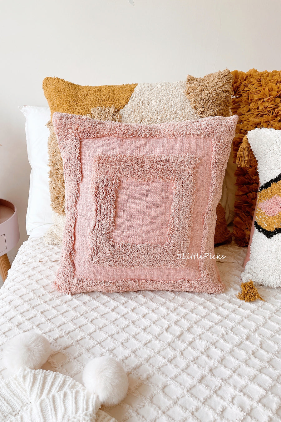 A gorgeous cushion to add on the beautiful texture to your living space whether to place it on your sofa, bed or reading nook. This 100% handmade cotton slub cover in dusty pink is with fluffy tufted geometric patterns for added texture, it would sit perfectly in a boho and contemporary inspired home.