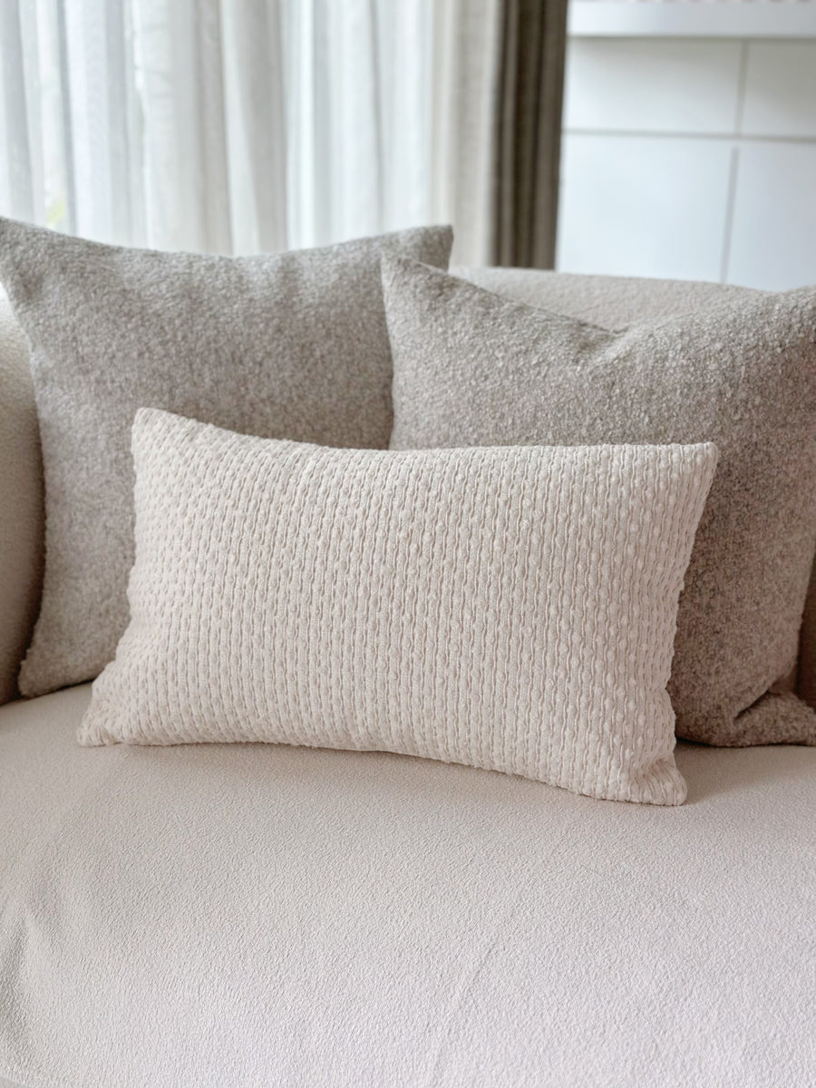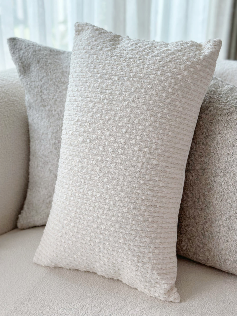 Experience the simple elegance and comfort with our off-white waist cushion cover. Made from a soft and durable wool-linen blend, this cover brings a touch of warmth to any space. The front features subtle dotted details for a hint of texture, while the back remains plain for a clean, minimalist look. Perfectly sized to fit standard waist cushions, it's easy to clean and ideal for everyday use. Add this charming piece to your home for an instant cozy update.
