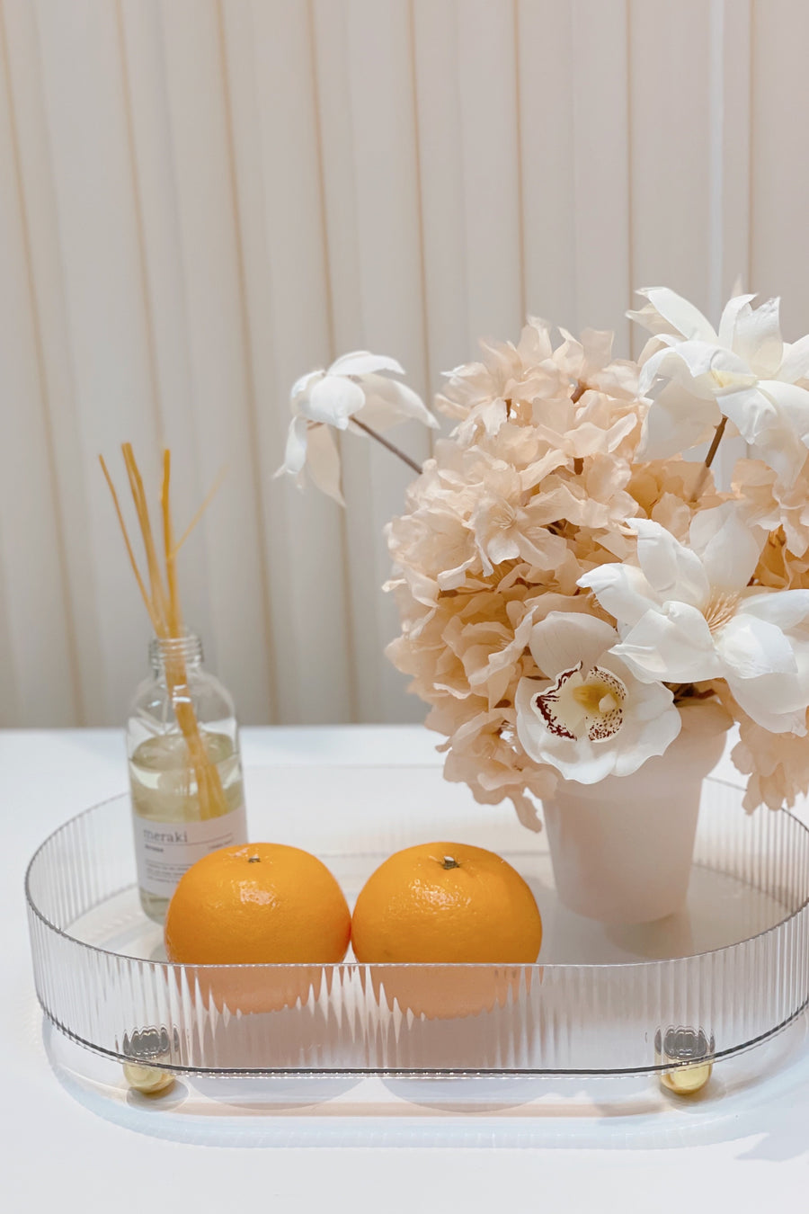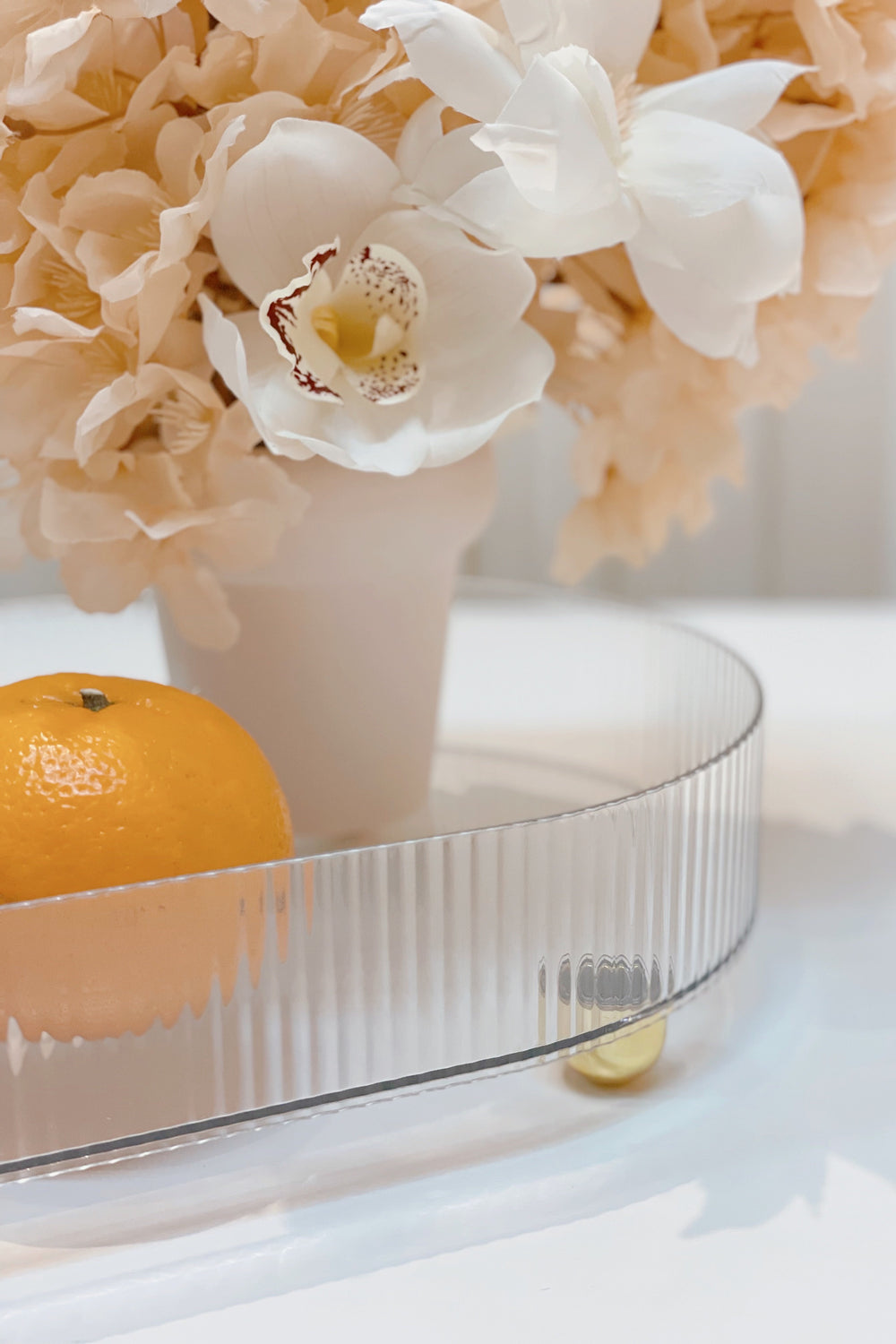 The transparent material allows the items on the tray to be easily seen and appreciated. The oval shape of the tray makes it versatile and can fit in different spaces and tables.