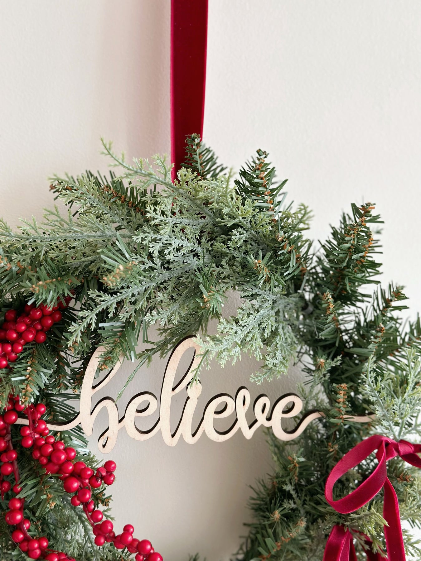 Add a touch of festive elegance to your home with our Believe in the Magic Wreath. Crafted from two types of lush faux pine branches, this wreath creates a beautifully layered and full appearance. The rich red berry branches bring a classic holiday charm, while the deep red velvet bows add a touch of sophistication. The delicate wooden die-cut word ‘believe’ hangs gracefully across the wreath, reminding us all to hold onto the magic of the season. Finished with a matching velvet ribbon on top for easy hanging, this wreath is the perfect blend of tradition and inspiration for your holiday decor