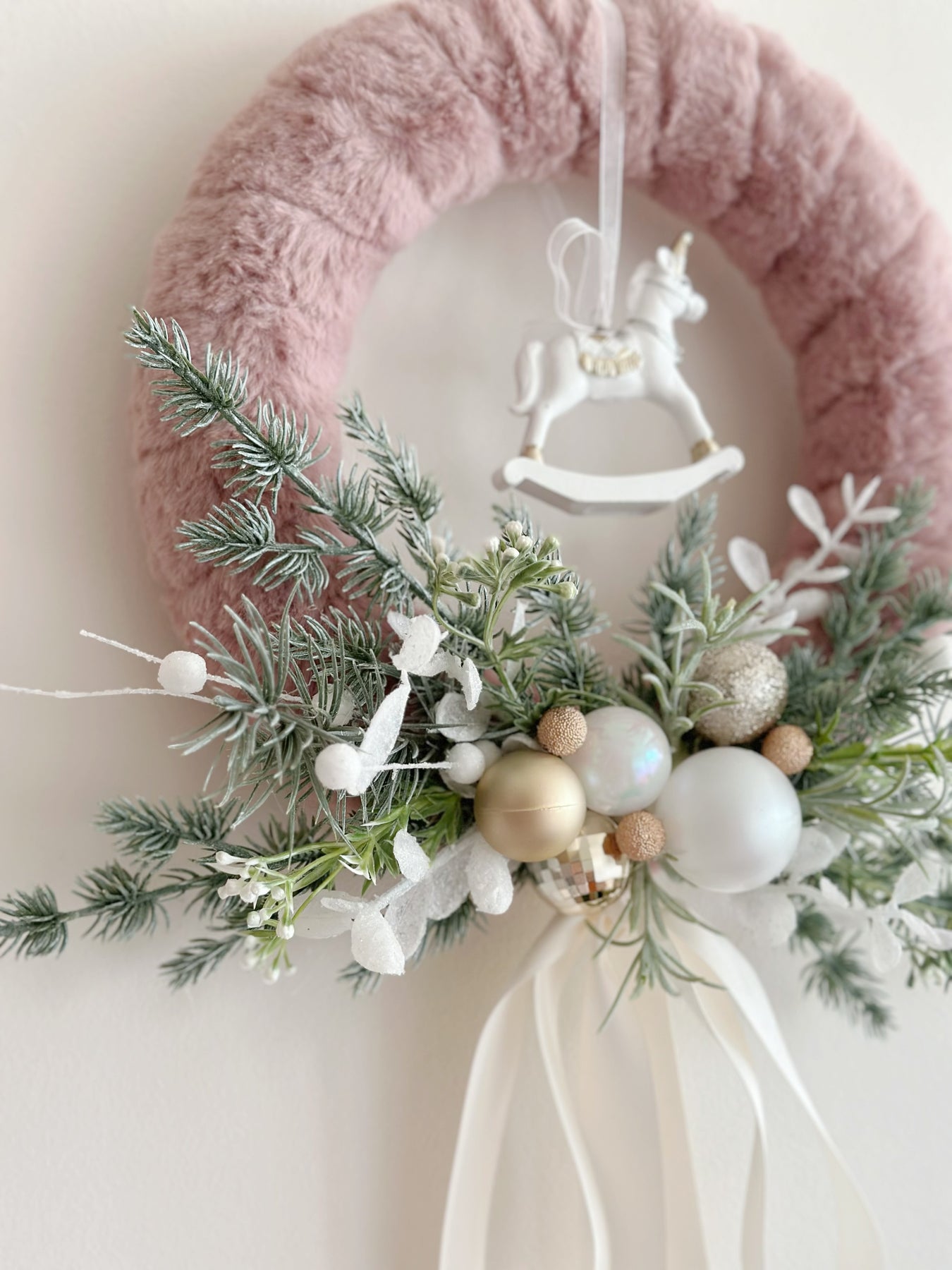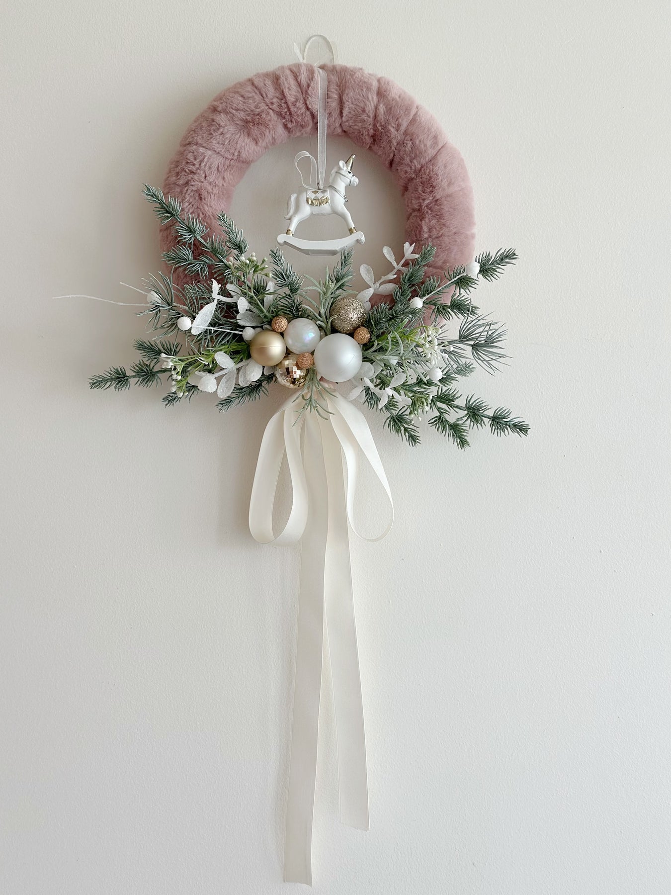 Add a touch of whimsy and elegance to your holiday decor with our Unicorn Frost Dream Wreath. This enchanting piece features a soft dusty pink faux fur base, creating a cozy yet sophisticated backdrop. Adorned with frosted faux pine branches, champagne gold, white, and iridescent baubles, this wreath radiates festive charm. At its heart, a dreamy white resin unicorn rocking horse floats midair, adding a magical focal point. The design is finished with a flowing satin white ribbon bow for a touch of timeless grace.