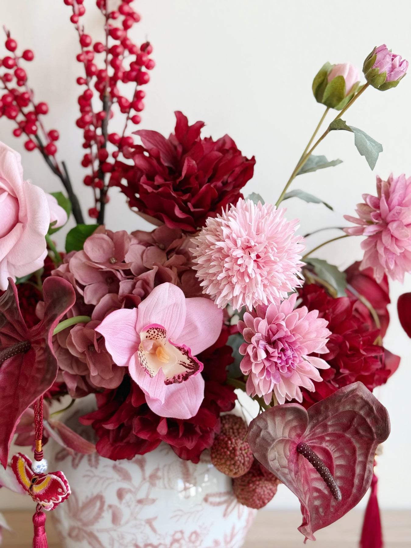 This front-facing floral display features a rich harmony of deep reds, soft blush pinks and gentle muted tones, layered with textural blooms and delicate accents. The composition feels full yet balanced, symbolising good fortune arriving naturally and blessings gathering over time. Subtle festive details add a refined celebratory touch without overwhelming the space.