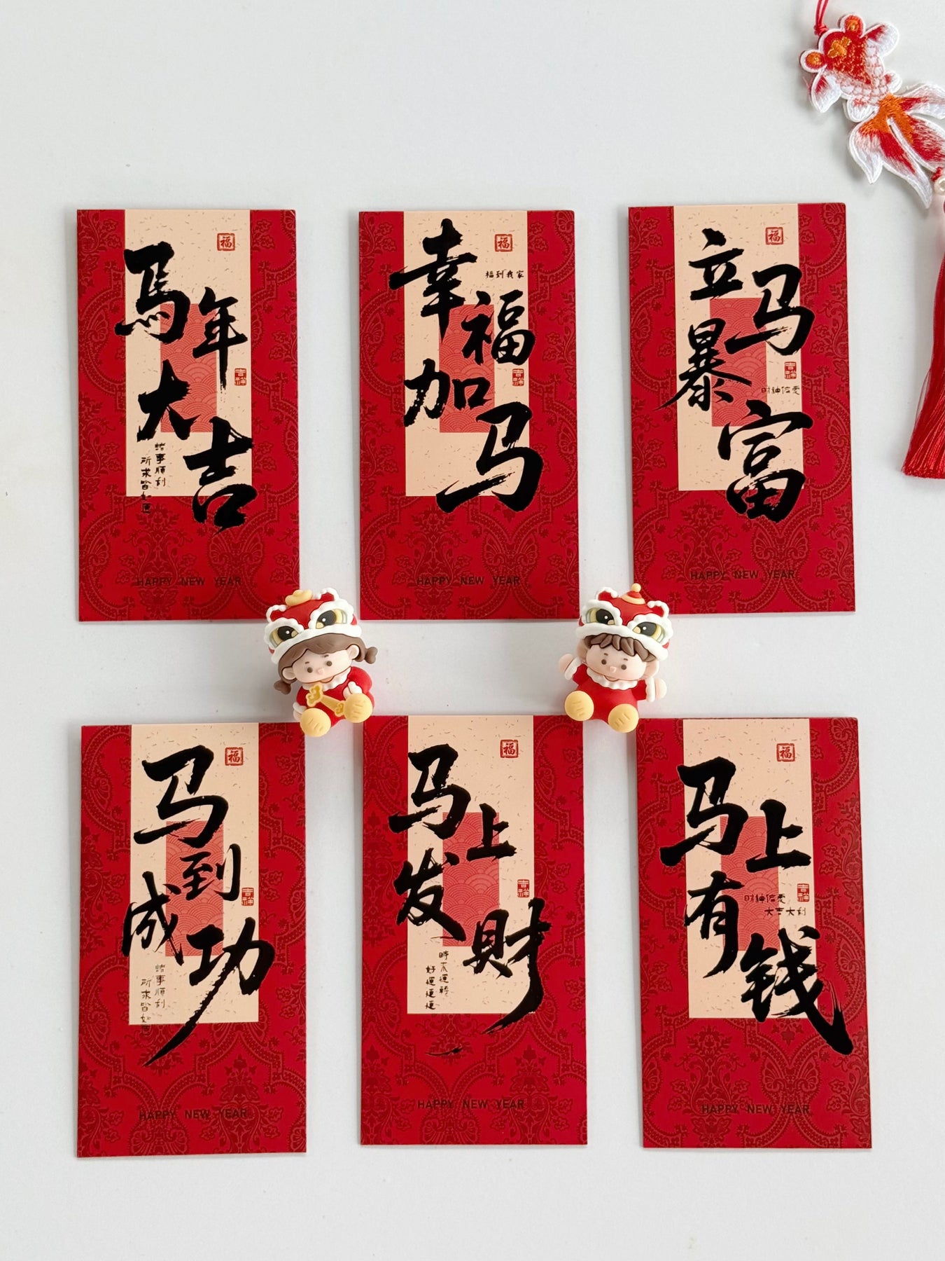 A timeless set of 6 red packets featuring classic Chinese calligraphy blessings.