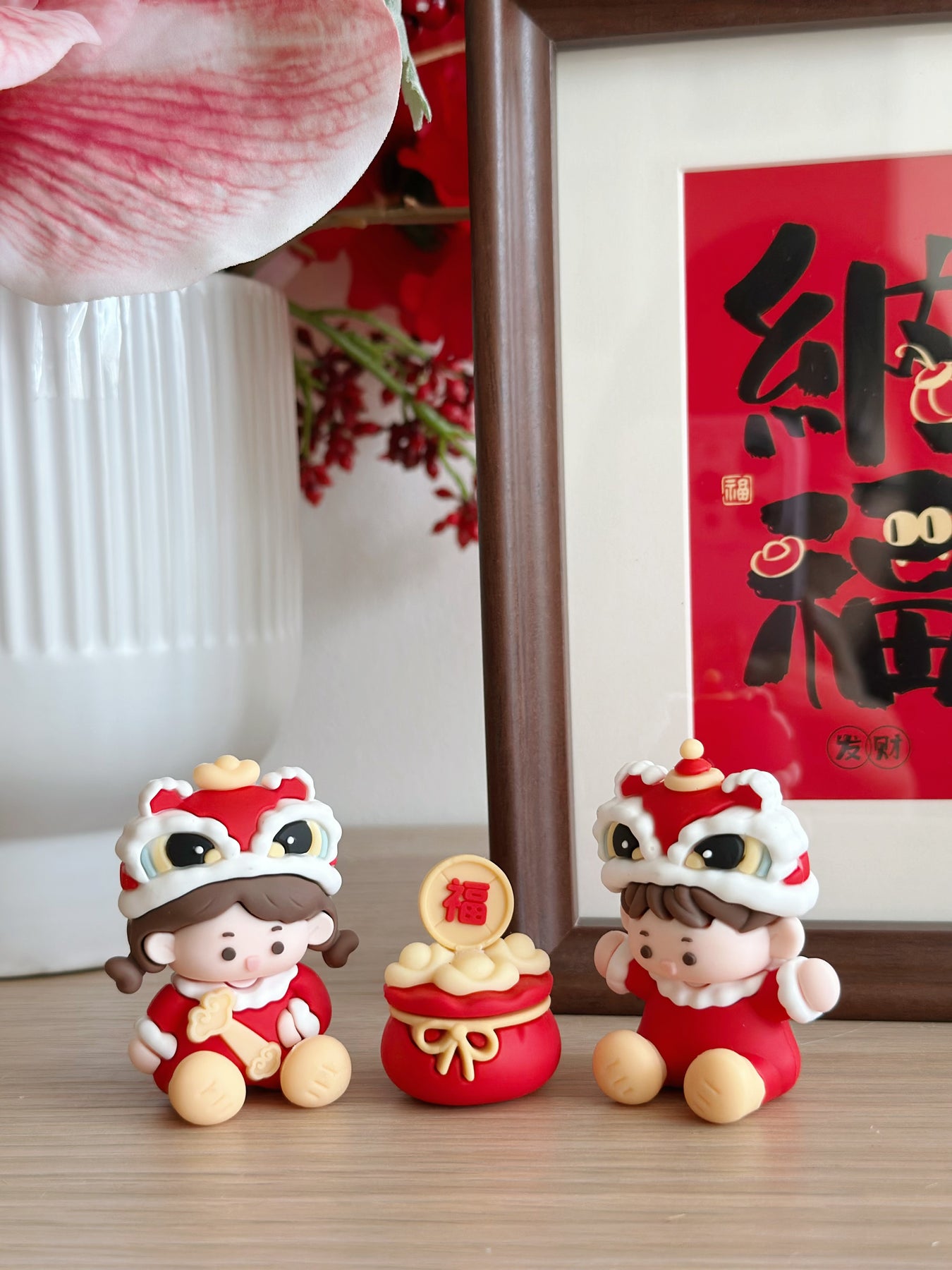 • Set of 3 Decor Pieces: Includes a boy and girl in lion dance costumes and a bucket of golden ingots.