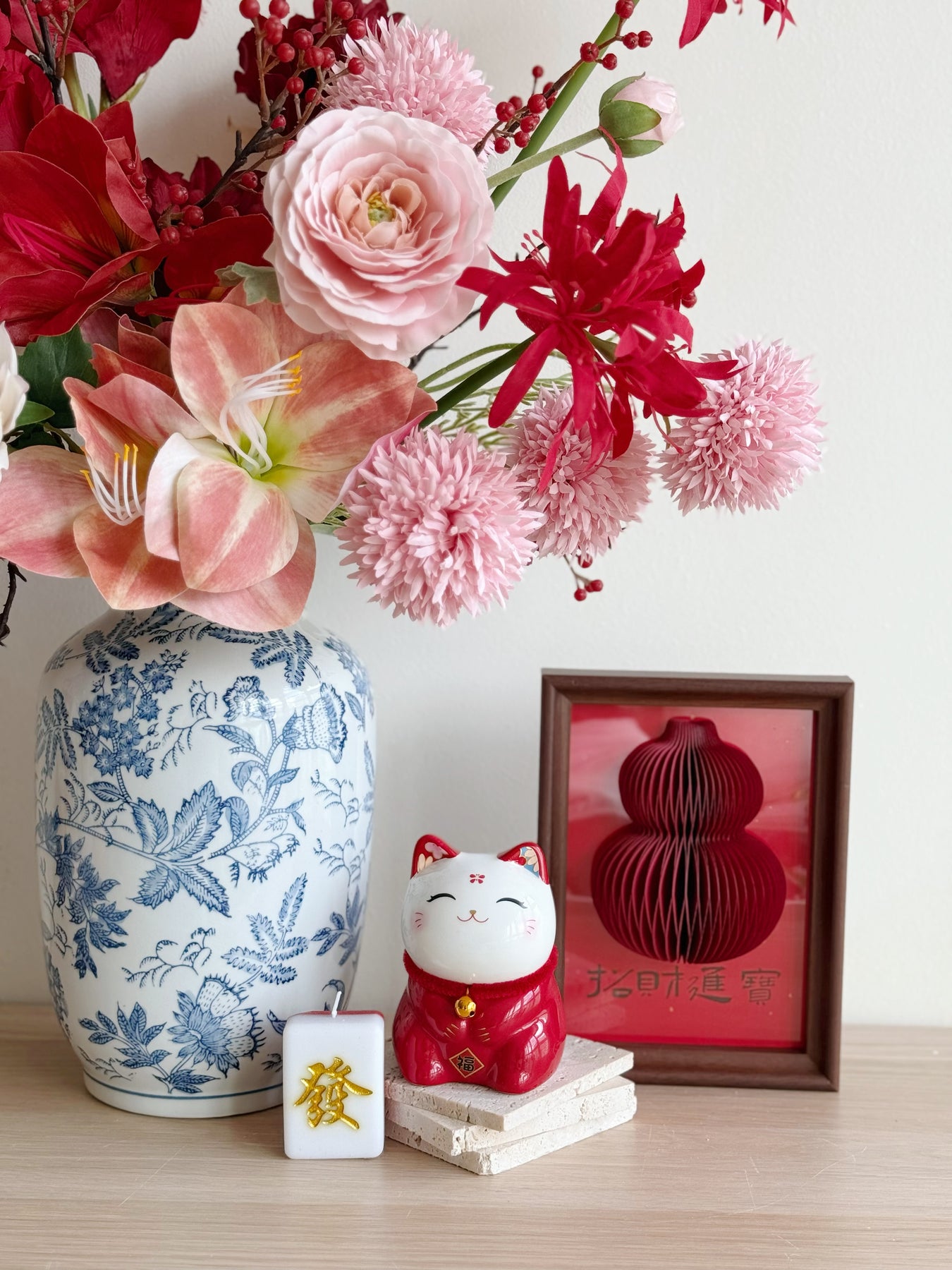 Invite wealth and prosperity into your home with this auspicious CNY frame display featuring the classic blessing 招财进宝. Set on a rich festive red background and finished with a honeycomb paper gourd, it symbolises abundance and good fortune for the year ahead.