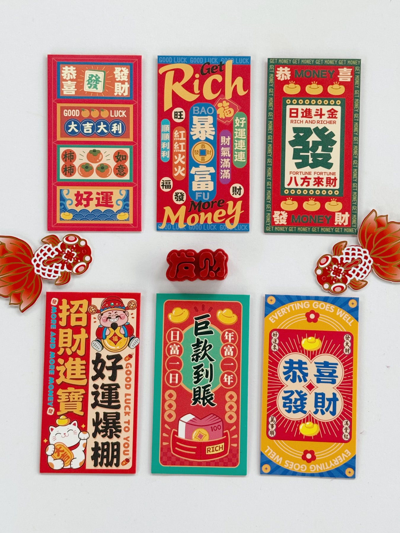 A lively set of 6 red packets filled with fortune symbols, money motifs, and auspicious wishes.