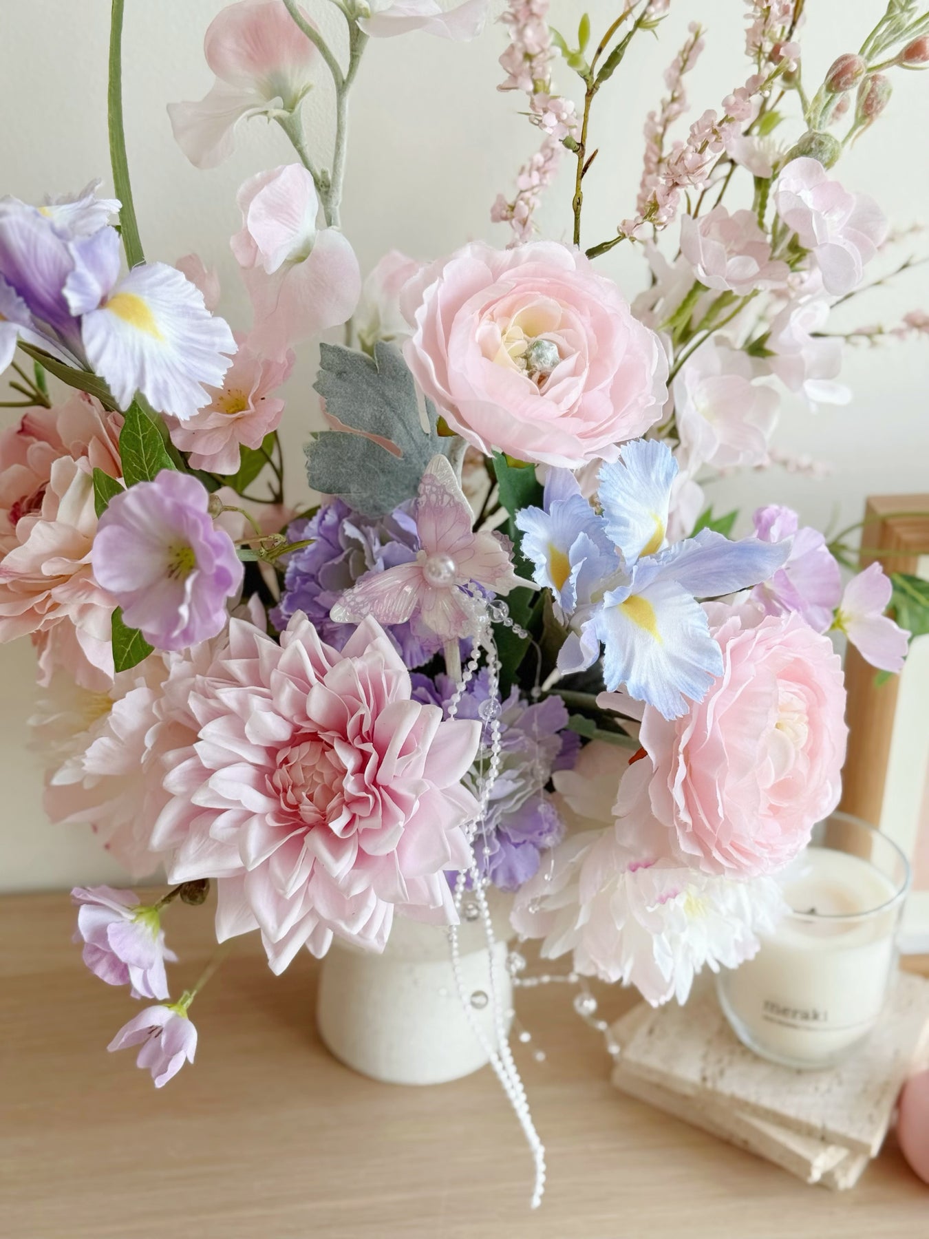 A soothing arrangement designed to bring calm joy and quiet blessings into the home. Gentle Joy features a harmonious blend of blush pinks, soft lilacs and creamy whites, layered with airy blossoms and delicate textures for an effortlessly graceful look.