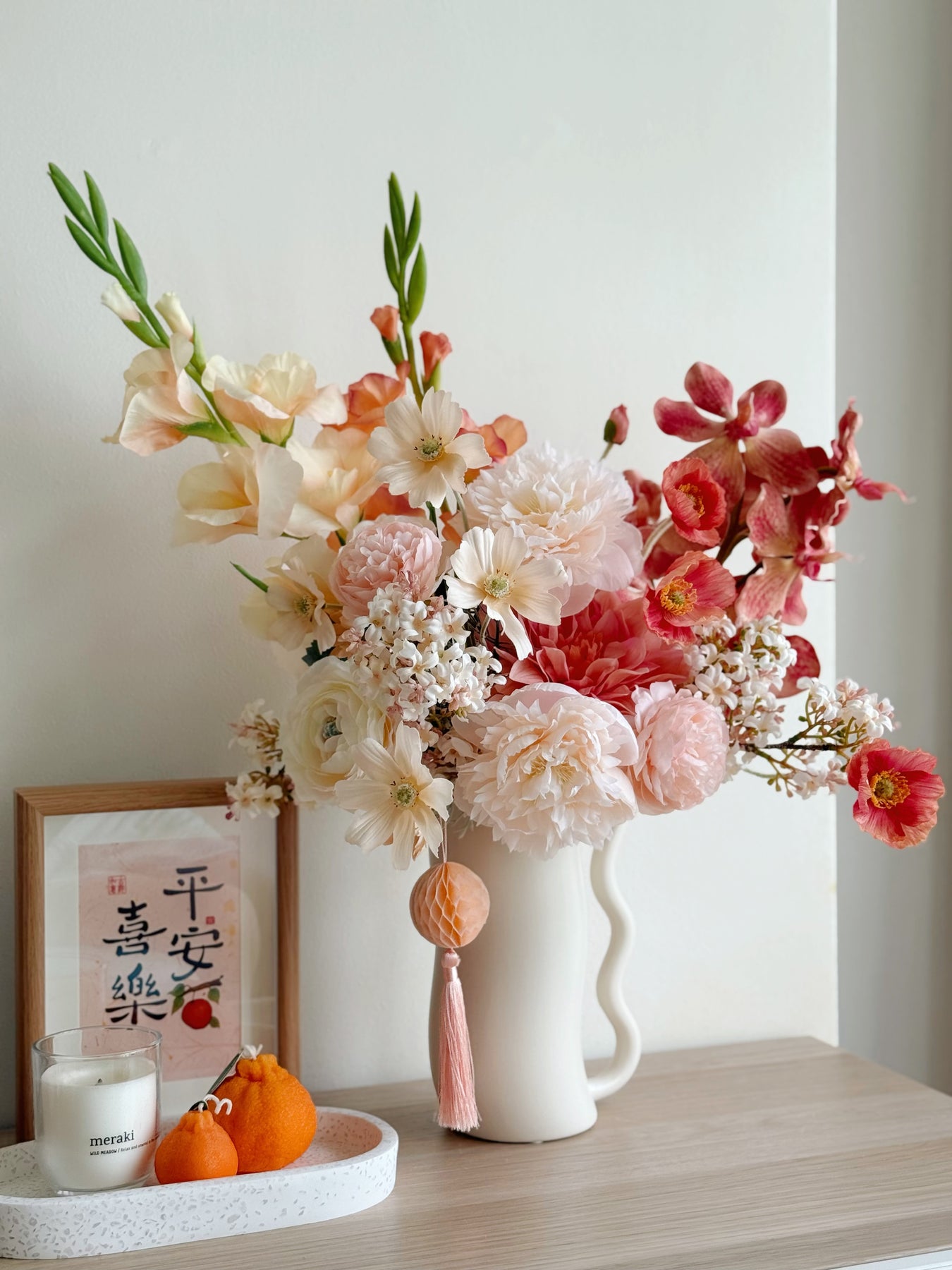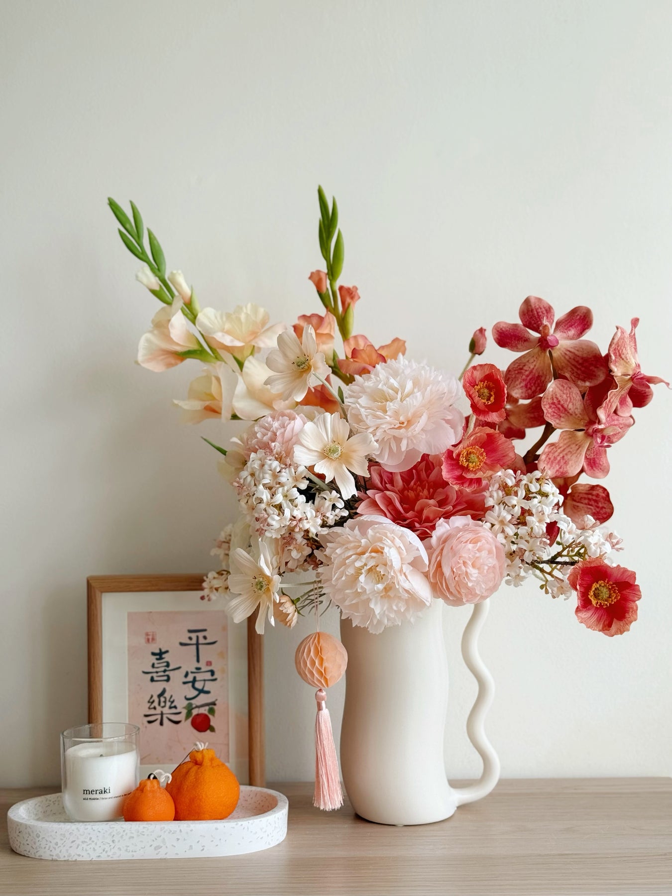 This front-facing floral arrangement features a harmonious blend of creamy whites, soft blush tones and warm peachy hues, accented with fresh coral-red florals for a cheerful pop of colour. The composition feels light, optimistic and full of life — symbolising blessings unfolding naturally and joyful moments finding their way home.