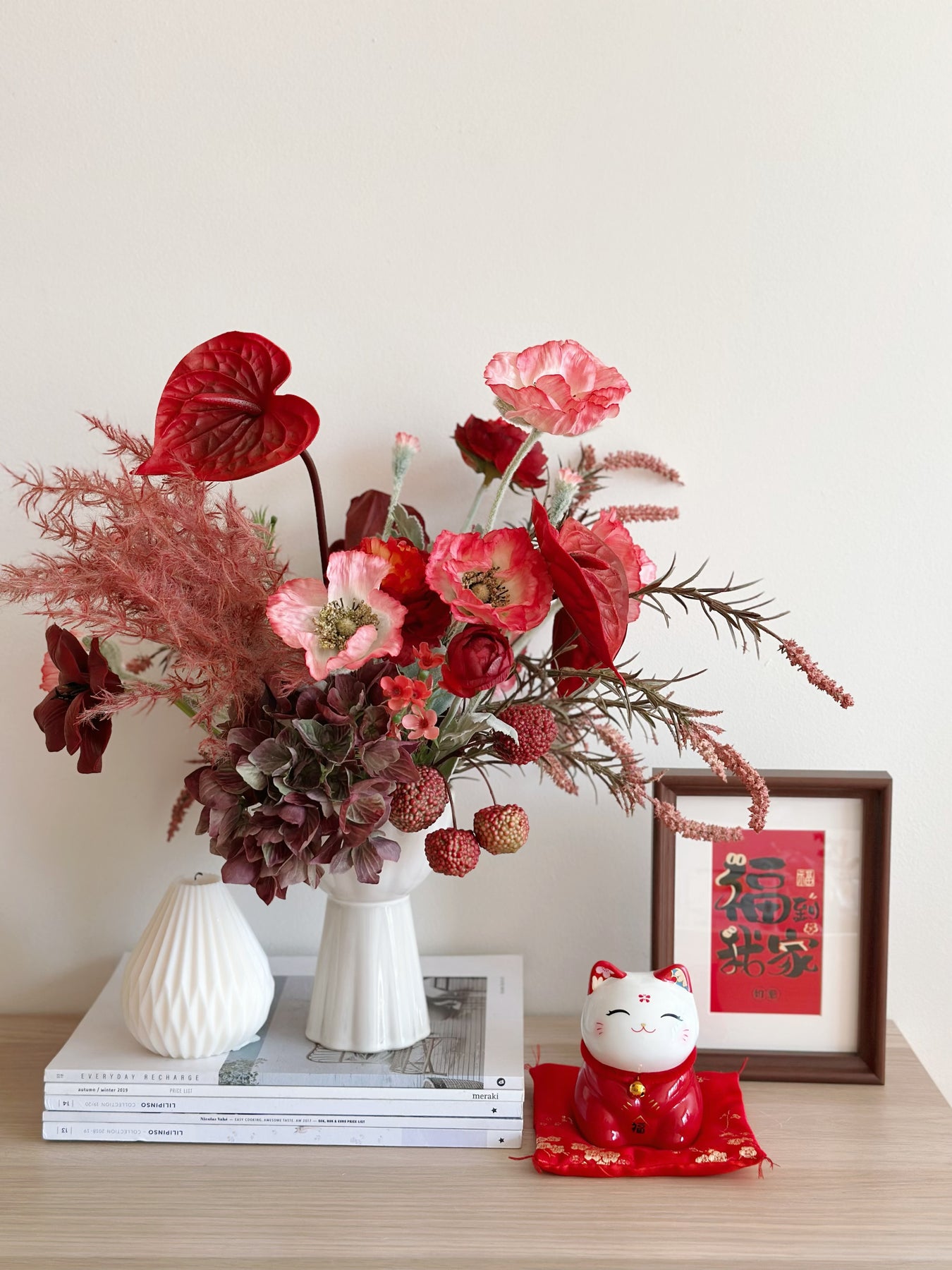 Nestled on a traditional red cushion pad adorned with golden prints, this lucky cat carries cultural charm while symbolizing prosperity and good luck. Perfect for gifting or as a centerpiece in your festive décor, it embodies timeless tradition and joyful energy.