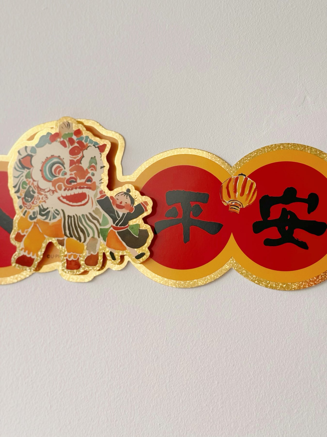 A festive Chinese New Year decor featuring a joyful lion dance design with the auspicious blessing “出入平安”. Finished with rich red tones, golden accents and raised 3D elements, symbolising safety and peace wherever you go.