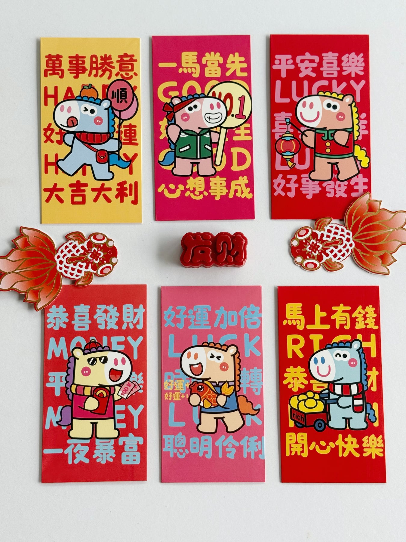 A cheerful set of 6 red packets featuring adorable horse characters and joyful New Year messages.