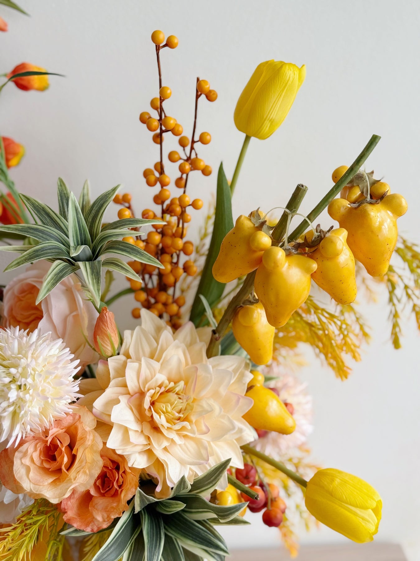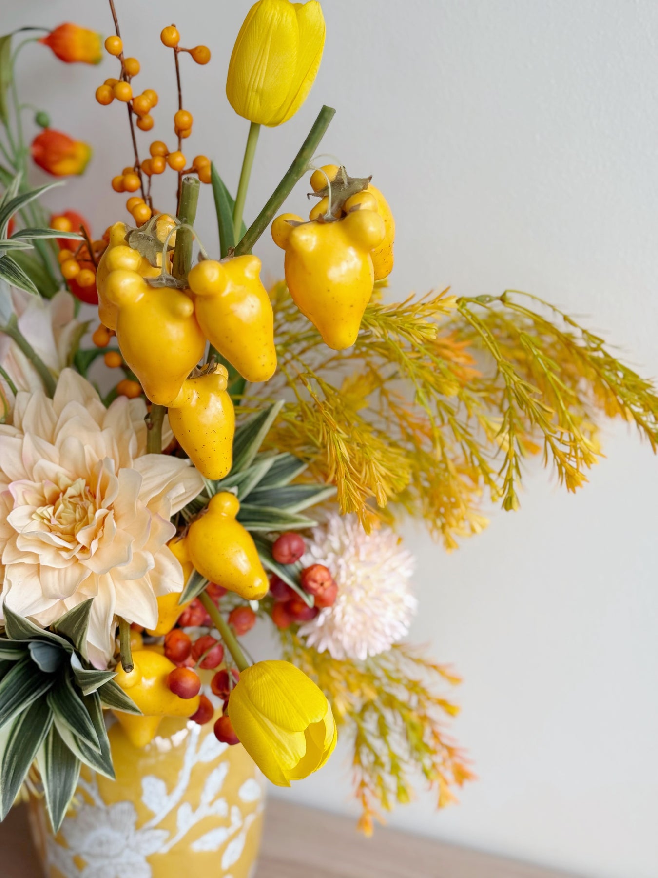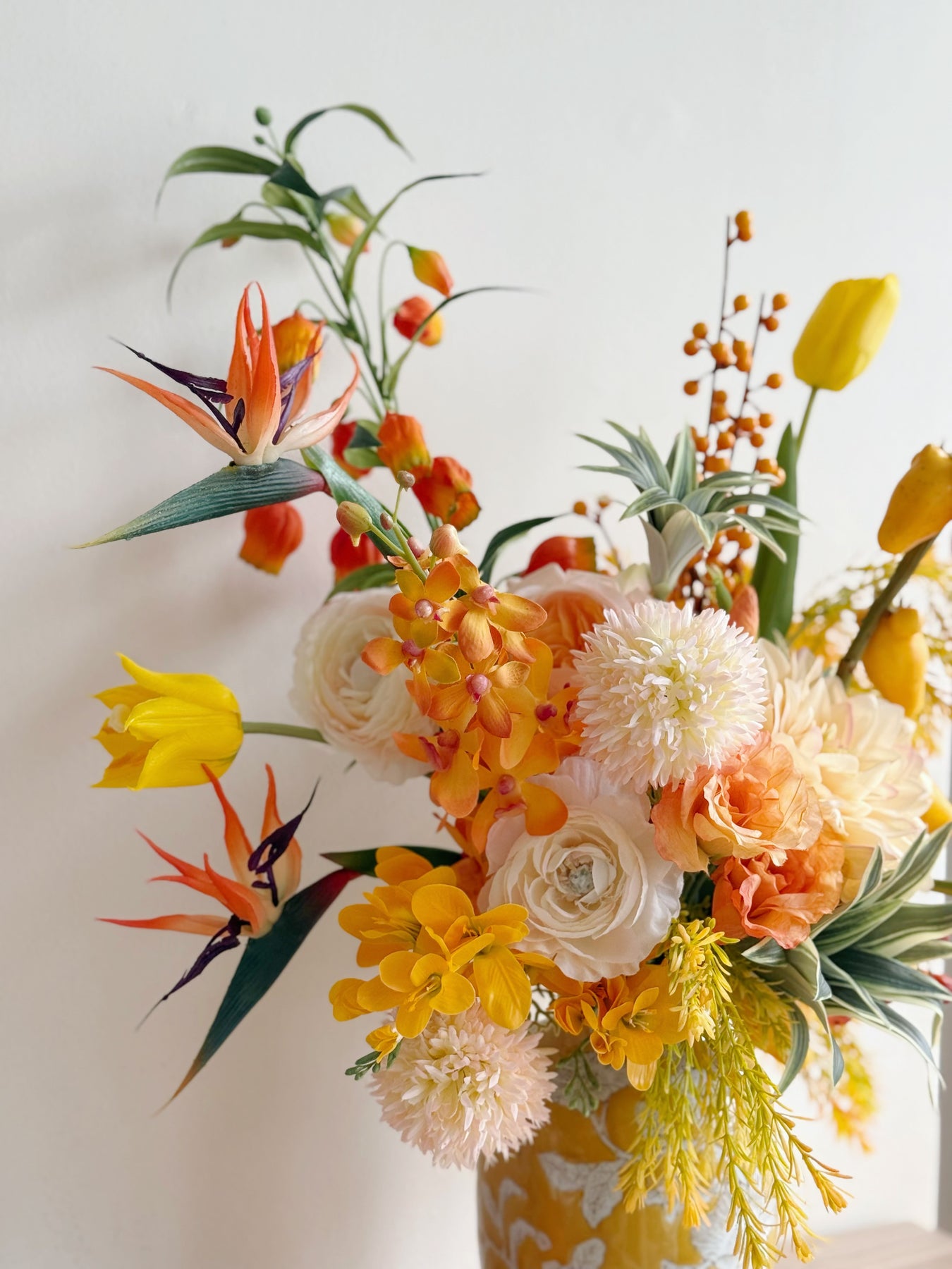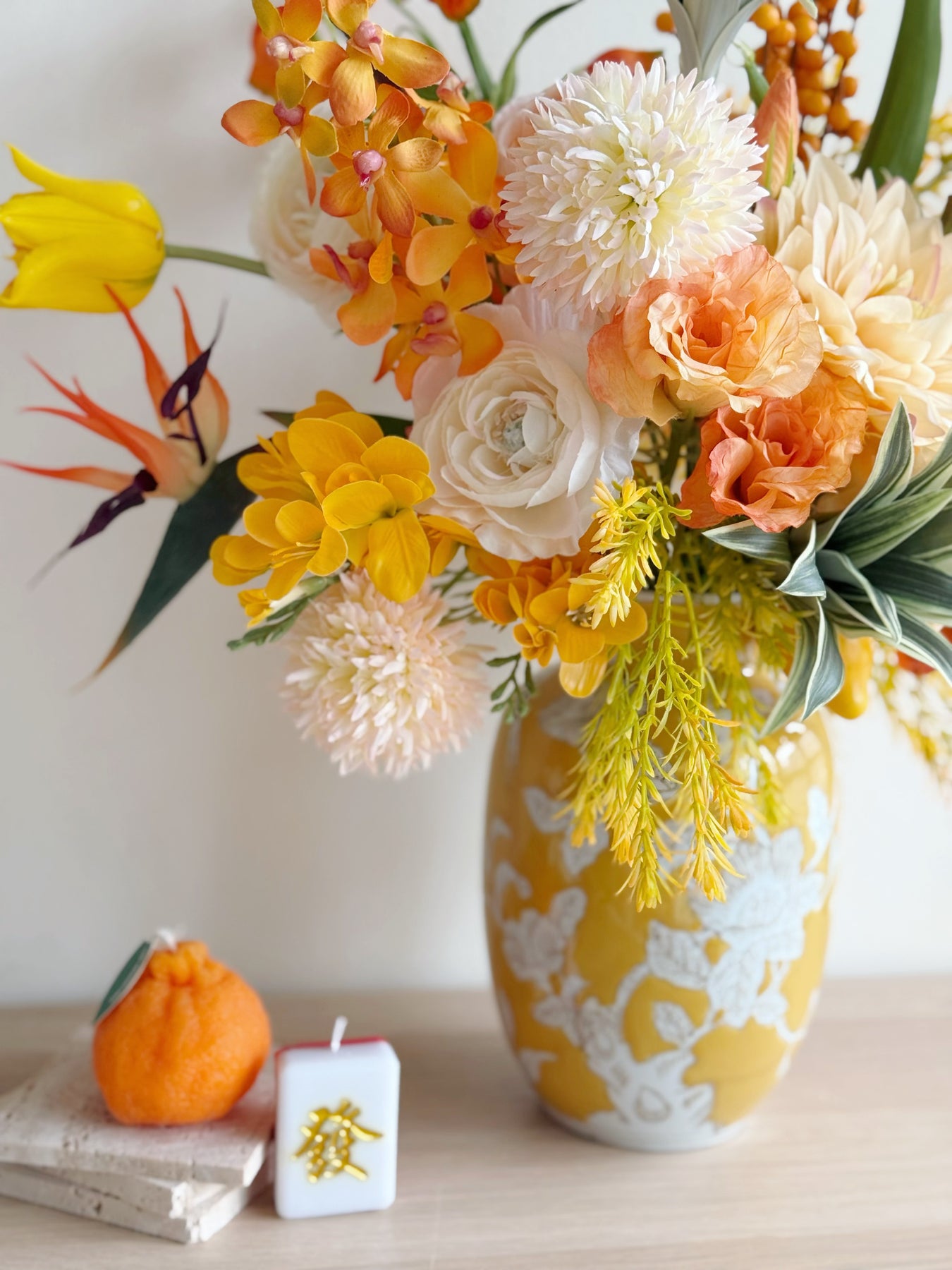 Presented in a classic ceramic vase, this arrangement balances timeless elegance with festive warmth, making it a striking addition to entryways, consoles or feature shelves. It brings a refined yet joyful presence that elevates the home throughout the Lunar New Year season.