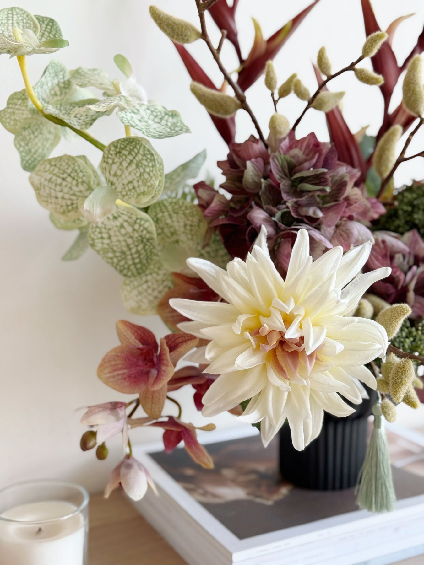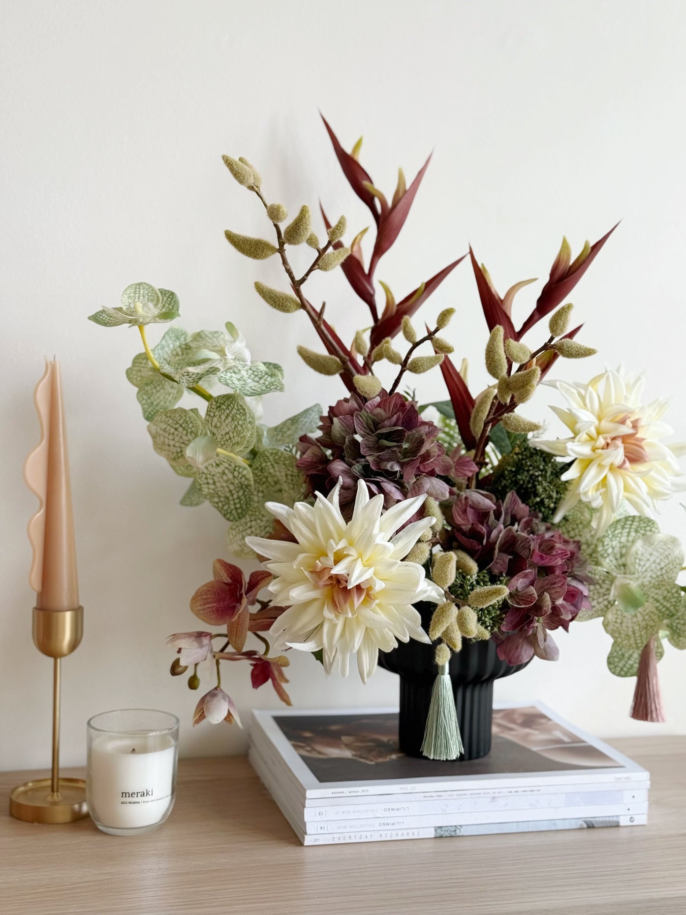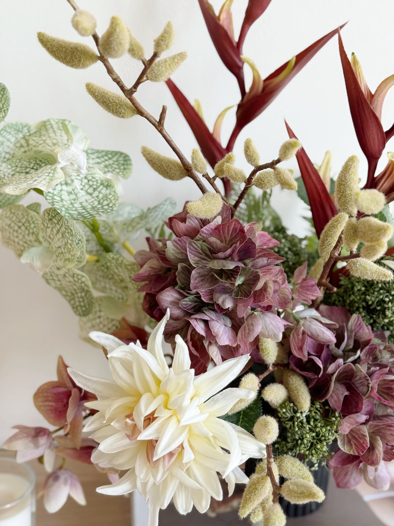 富贵满序 brings together florals rich in form and symbolism — elegant 富贵菊, graceful orchids, architectural heliconia, and magnolia buds — arranged in a layered, directional composition that celebrates structure and balance. The palette is grounded and refined, offering a modern interpretation of Lunar New Year auspicious elements without excess or ornamentation.