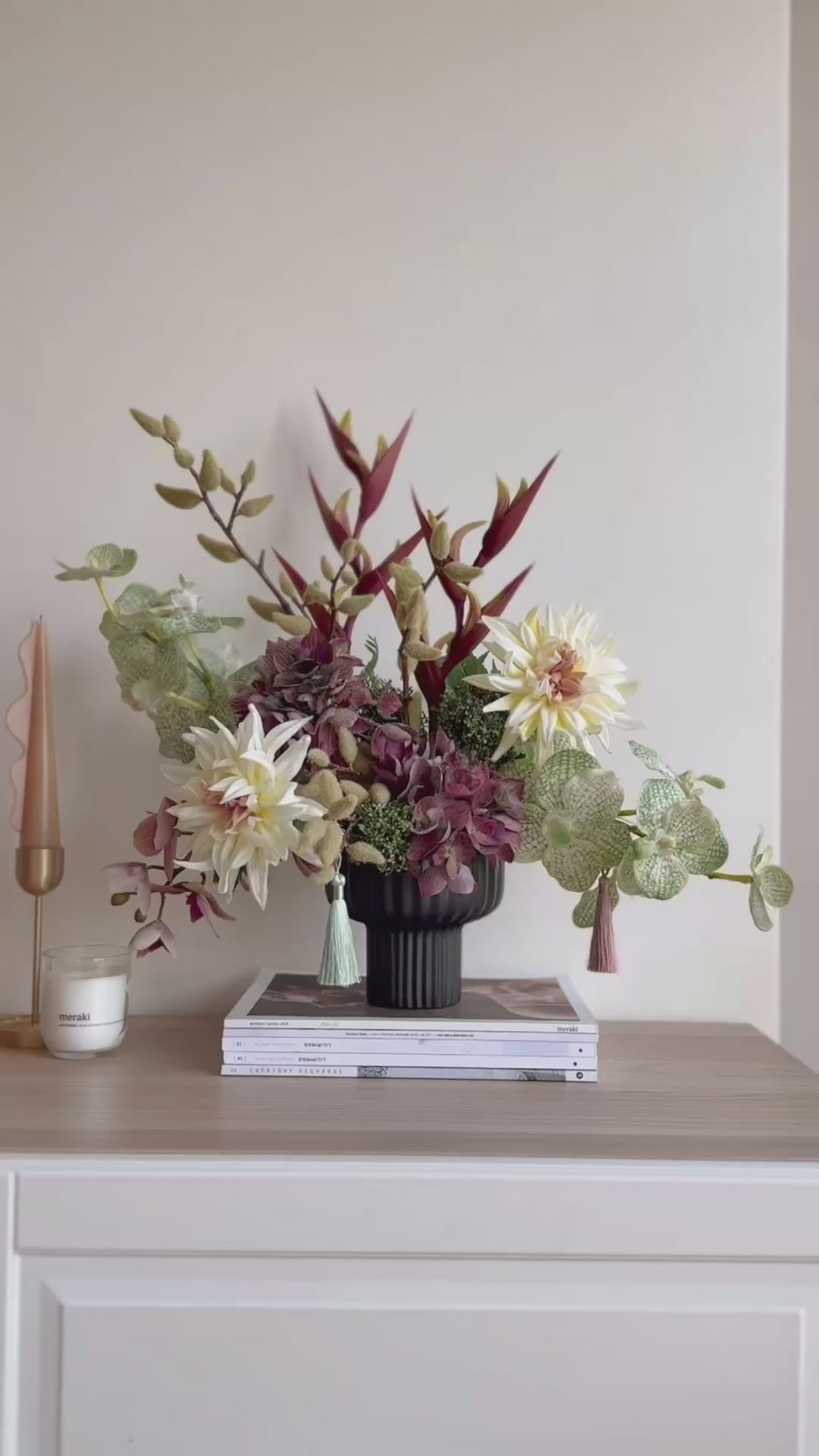 Nested in a fluted black porcelain vase with a soft semi-matt finish, the arrangement feels bold yet composed. Subtle tassel accents add just a hint of festive warmth, allowing the piece to transition effortlessly from seasonal styling to year-round display.