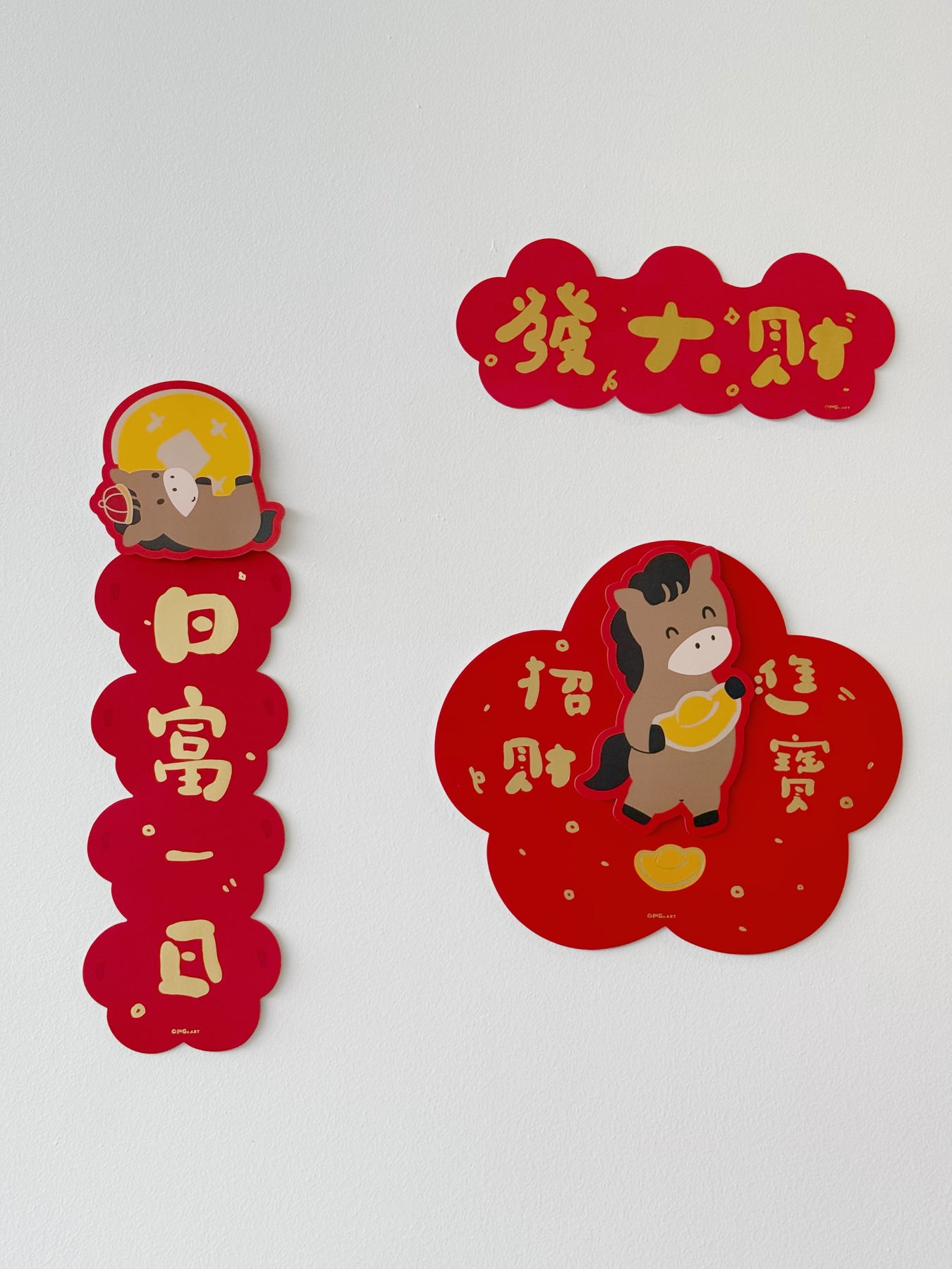 A fun and festive small CNY couplets set centred around wealth and prosperity blessings. Featuring playful horse illustrations and classic lucky phrases, this design brings a joyful and lighthearted touch to your Chinese New Year décor.
