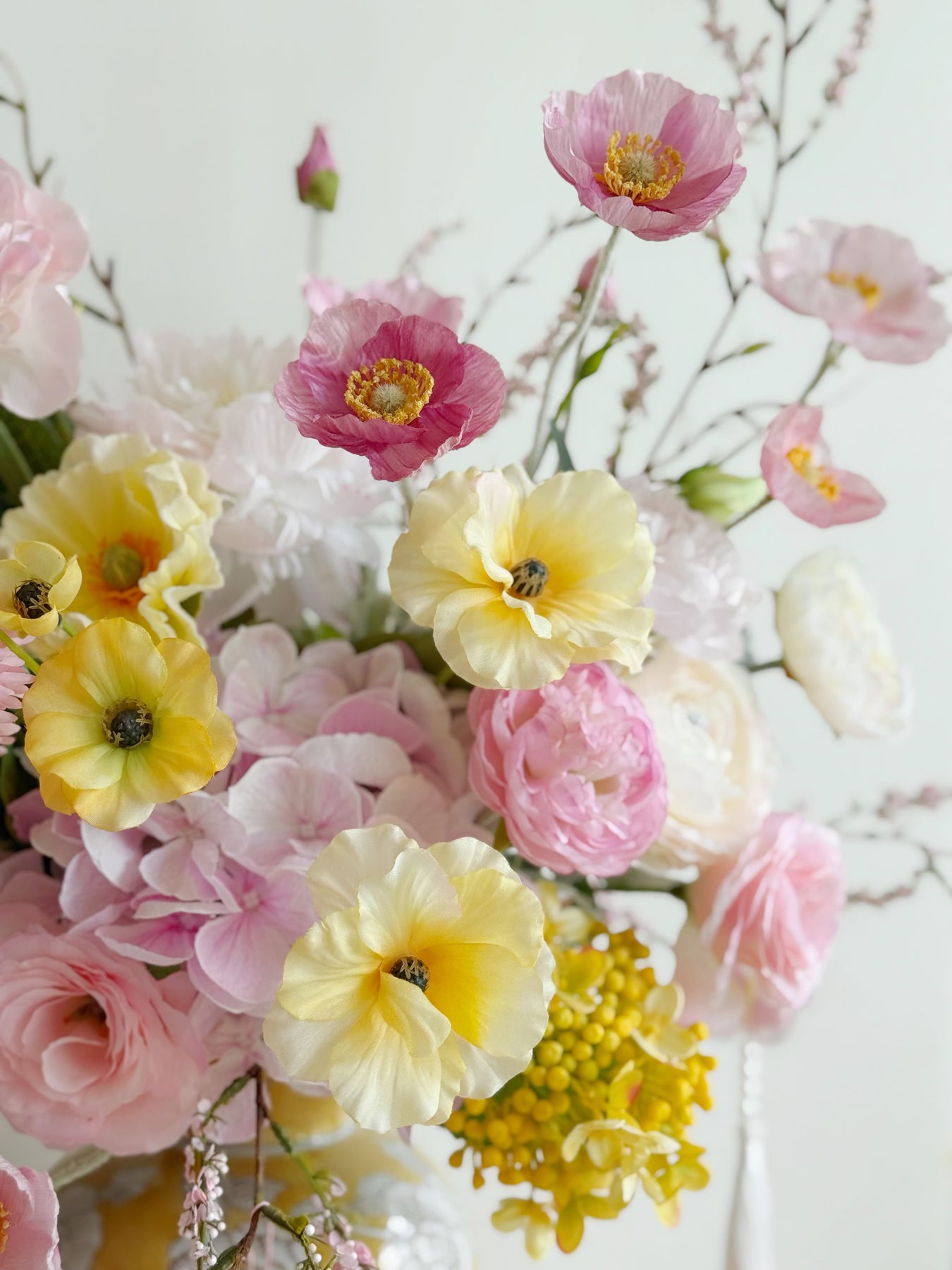 The front-facing floral composition features a cheerful blend of soft blush pinks, creamy whites and gentle buttery yellows, accented with airy branches and fresh spring-like blooms. The colours feel lively yet harmonious, creating a sense of movement and renewal — like flowers stretching towards the sunlight as the new year unfolds.