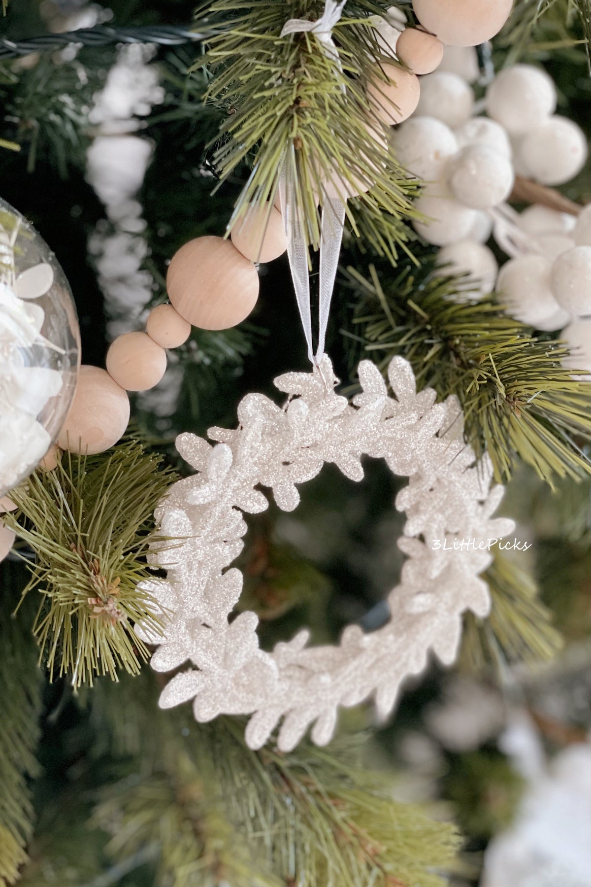 This pretty decoration embraces the essence of a dreamy Christmas theme we all love. The elegant white Christmas ornament features an intricate wreath with glitter all over. Hang proudly on your tree to celebrate the true spirit of the festive season.