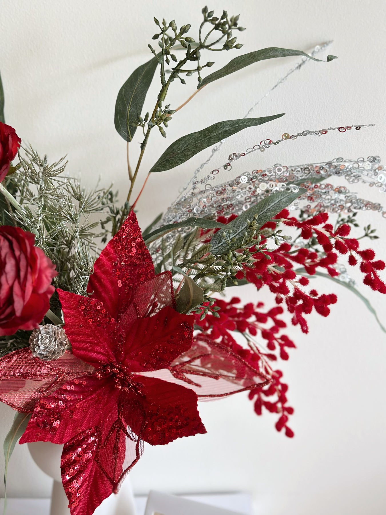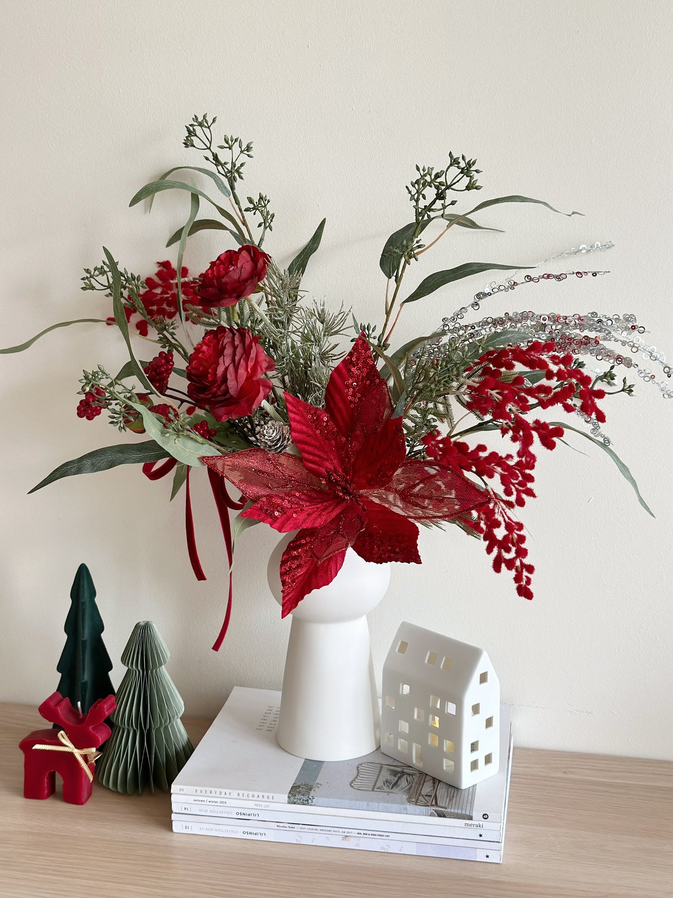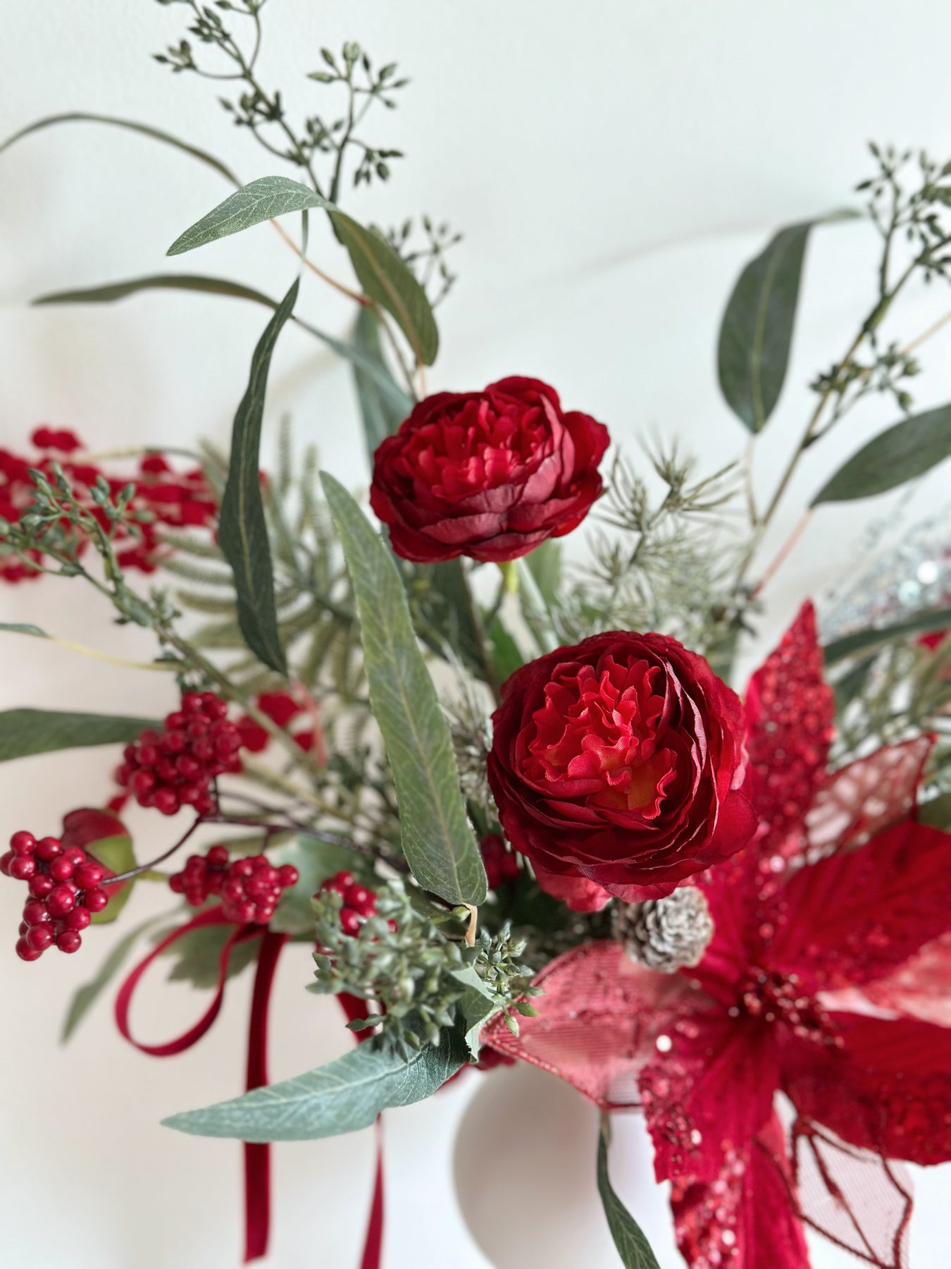 Celebrate the season with this stunning front-facing arrangement, Crimson Elegance in Vase. Designed with rich, deep green foliage and vibrant red blooms, this artificial floral piece captures the traditional Christmas spirit with a modern twist. Accented with a dash of silver glittery branches for that festive sparkle, it sits perfectly in a matte white porcelain vase. Whether displayed on a mantel, sideboard, or entryway, this arrangement will effortlessly bring warmth and sophistication to any space.