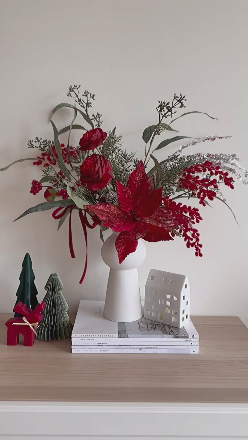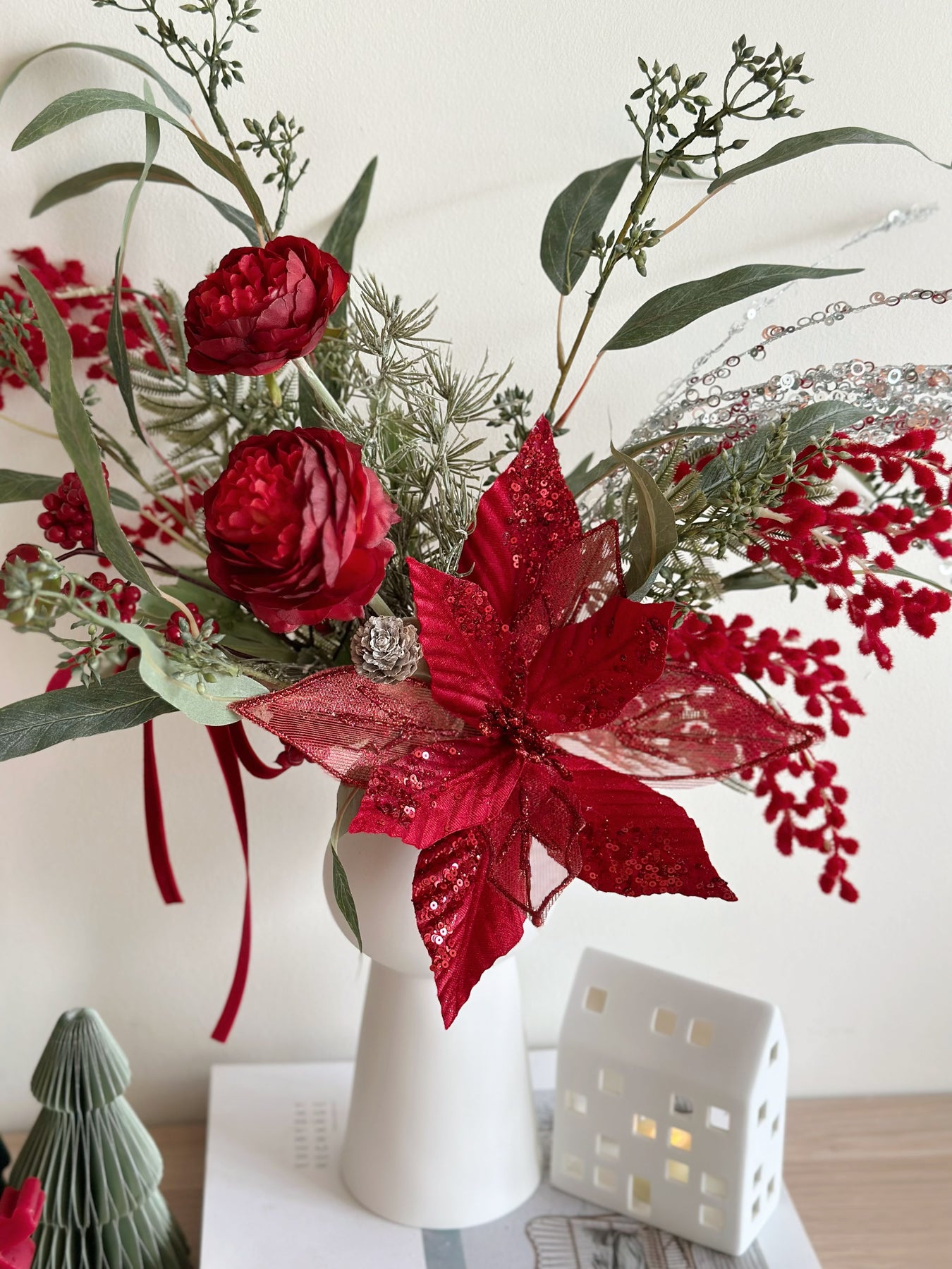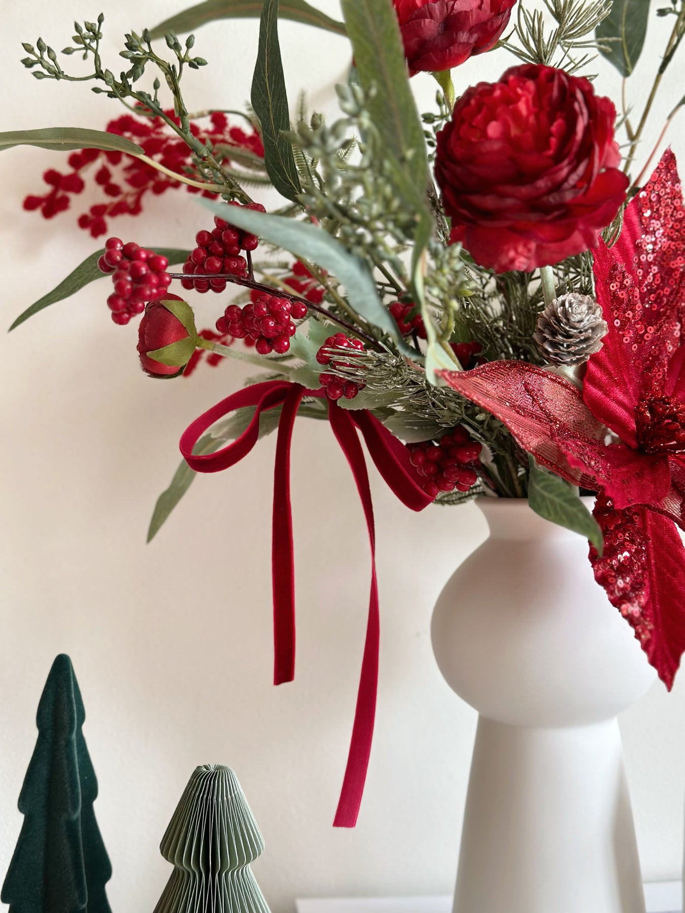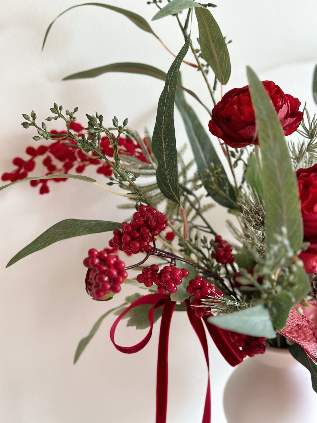 Celebrate the season with this stunning front-facing arrangement, Crimson Elegance in Vase. Designed with rich, deep green foliage and vibrant red blooms, this artificial floral piece captures the traditional Christmas spirit with a modern twist. Accented with a dash of silver glittery branches for that festive sparkle, it sits perfectly in a matte white porcelain vase. Whether displayed on a mantel, sideboard, or entryway, this arrangement will effortlessly bring warmth and sophistication to any space.