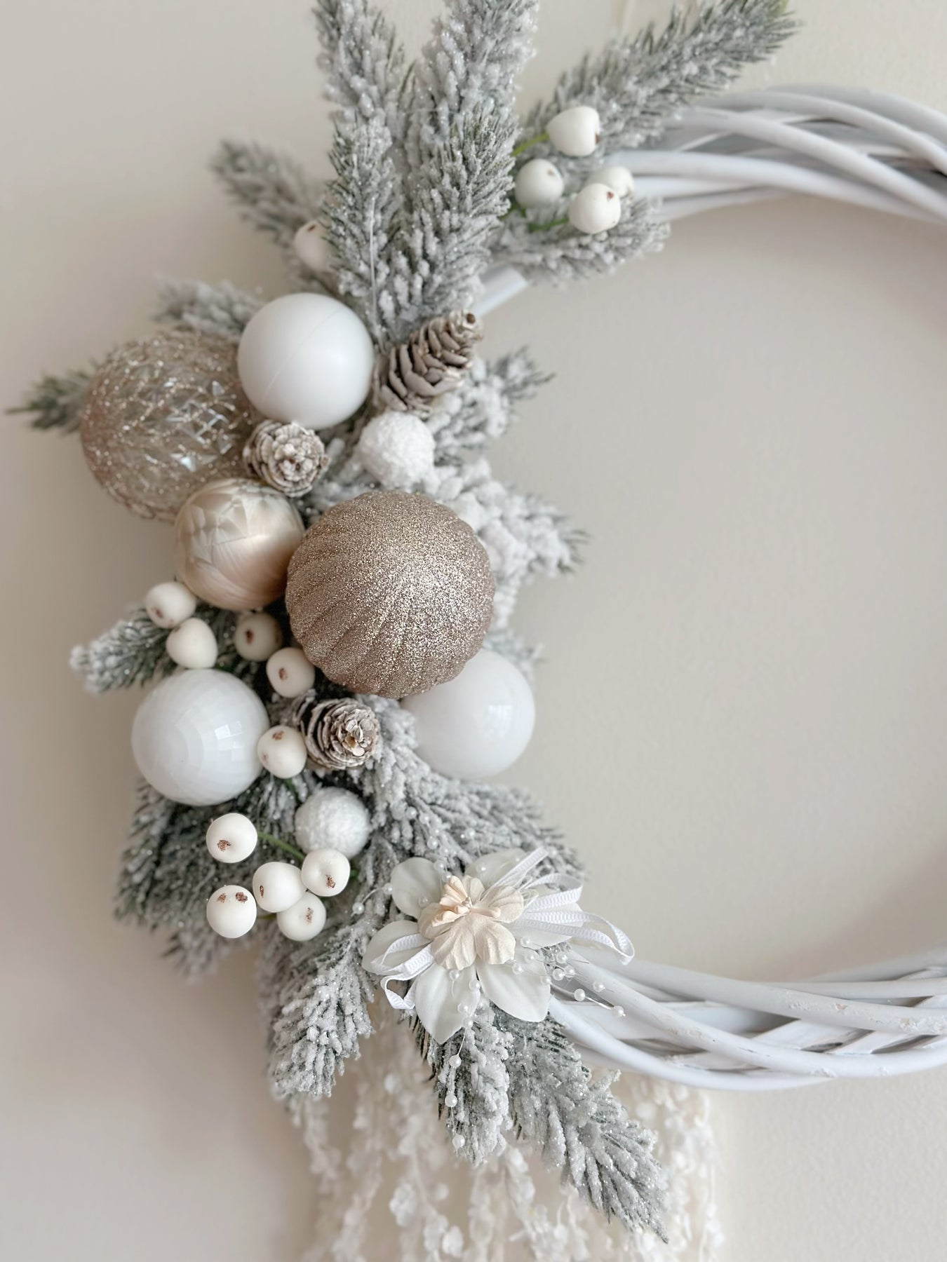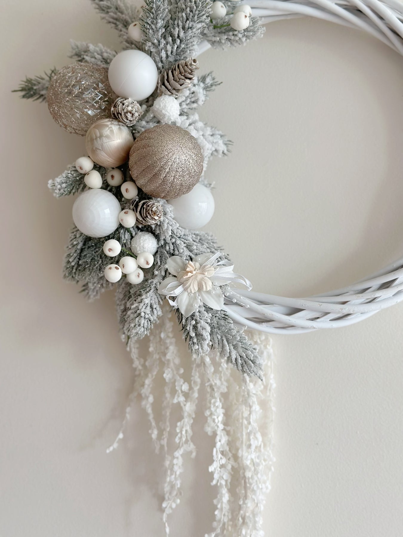 Add a touch of refined beauty to your holiday decor with the Frosted Elegance Wreath. Crafted with a white-washed rattan base, this handmade wreath exudes an organic, asymmetrical design, blending the natural charm of snowy branches with elegant faux berries and flowers. The champagne and white baubles, paired with delicately draping flowers, complete the wreath’s sophisticated look, creating a perfect balance between festive tradition and contemporary style. Ideal for those looking to elevate their Christmas decor with a timeless piece that brings a frosty, elegant charm to any space.