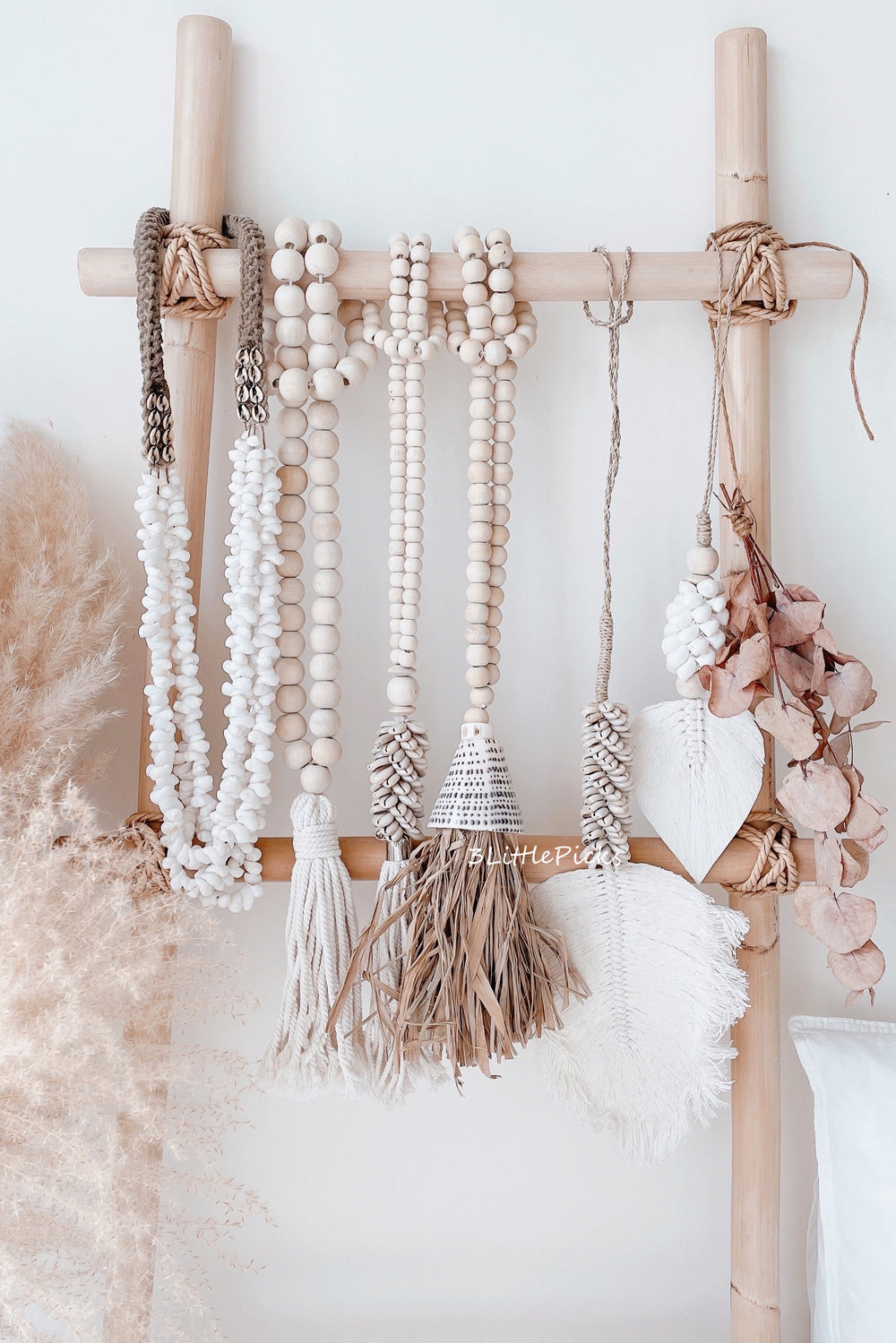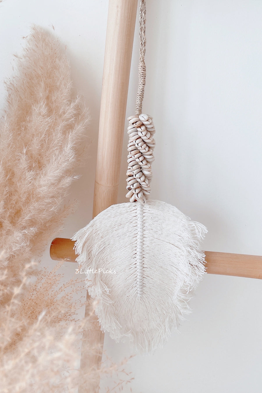 Beautiful wooden beaded chain with seashells and large cotton leaf for hanging on doorknobs, hooks. The collection of shells adds an ocean-loving inspiration while the cotton macrame leaf creation gives a softer and more earthy element to the piece.