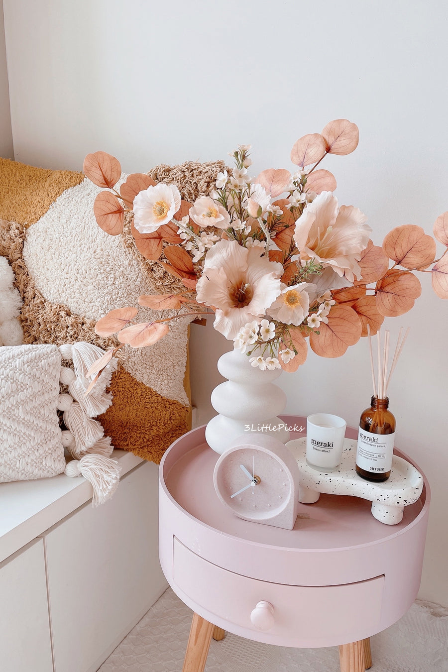 The “Tranquil Spring Day in the Pot” exudes the fresh awakening of spring. This 2-sided faux floral arrangement captures the essence of a serene spring morning. Each flower, from the delicate lilac and cheerful yellow to the pure white blooms accented with whispers of pale blue, is meticulously placed to invite the eye into a dance of color and tranquility. Anchored in a cream beige pedestal porcelain pot, this arrangement is a timeless piece, perfect for adding a touch of everlasting spring to any room. Its artful composition ensures that the beauty of a spring day can be enjoyed from angle, making it an ideal centerpiece for your home or a thoughtful gift for someone special.