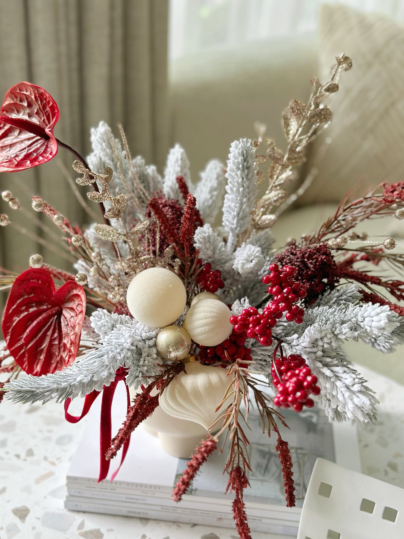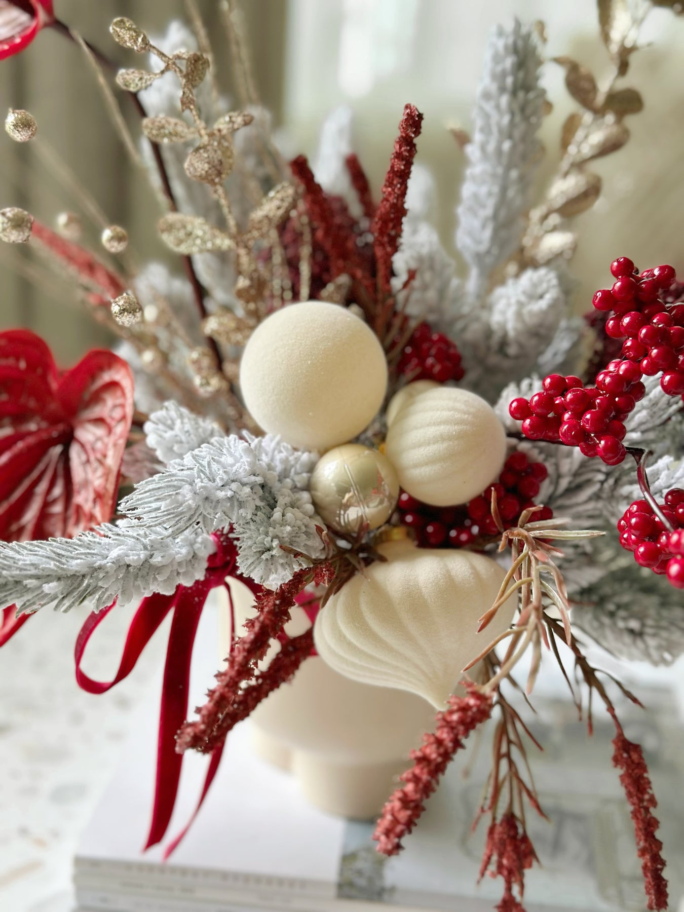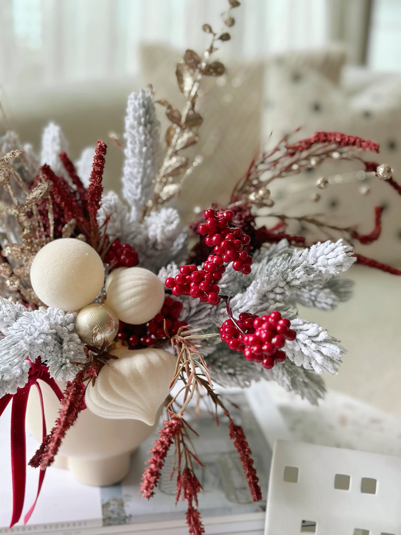 Add a touch of festive luxury to your space with our Velvet Frosted Charm in the Pot. This front-facing faux floral arrangement is a perfect centerpiece for the holiday season. Featuring snowy, glittery pine branches paired with deep red blooms and champagne golden accents, it radiates warmth and sophistication. The arrangement is adorned with velvety cream and champagne baubles, and finished with a deep red velvet ribbon bow, bringing a refined, festive flair to any room. Nestled in a cream porcelain flowerpot with a smooth finish, this design effortlessly complements modern and classic interiors alike. Celebrate the holidays with a statement piece that exudes timeless charm and requires no upkeep!