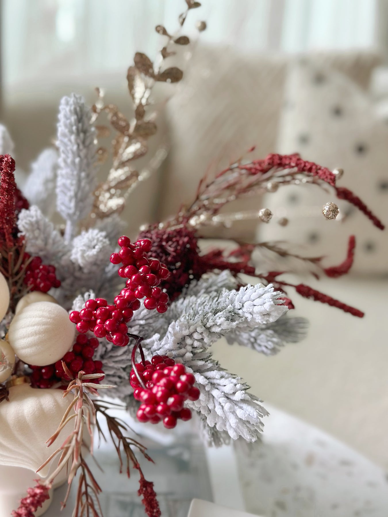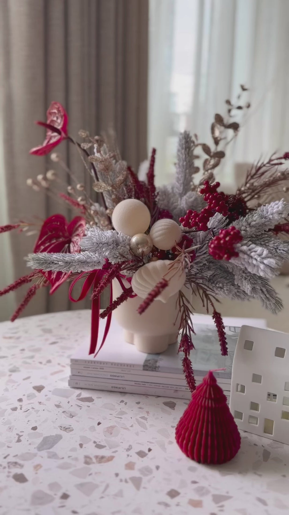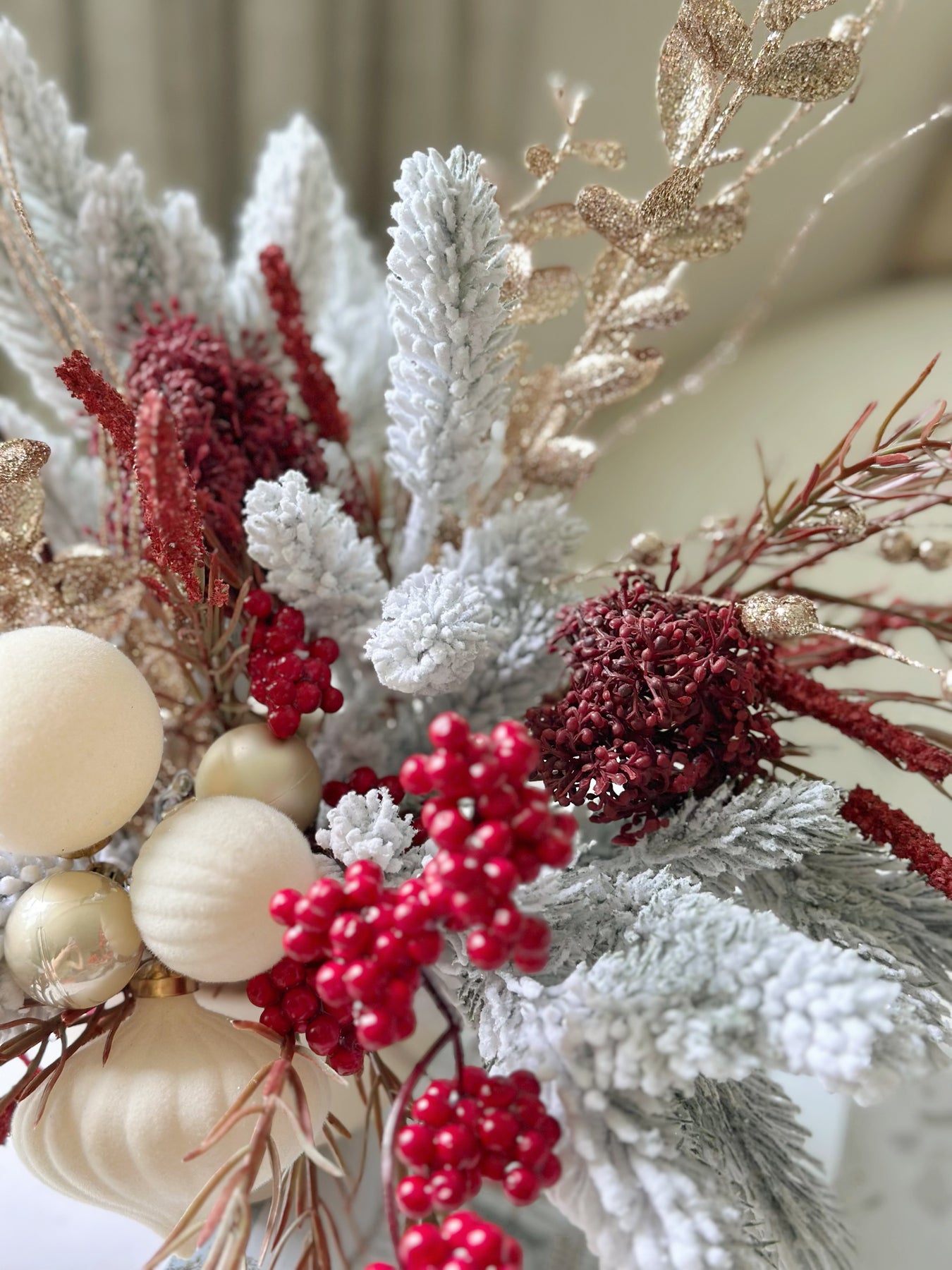 Add a touch of festive luxury to your space with our Velvet Frosted Charm in the Pot. This front-facing faux floral arrangement is a perfect centerpiece for the holiday season. Featuring snowy, glittery pine branches paired with deep red blooms and champagne golden accents, it radiates warmth and sophistication. The arrangement is adorned with velvety cream and champagne baubles, and finished with a deep red velvet ribbon bow, bringing a refined, festive flair to any room. Nestled in a cream porcelain flowerpot with a smooth finish, this design effortlessly complements modern and classic interiors alike. Celebrate the holidays with a statement piece that exudes timeless charm and requires no upkeep!